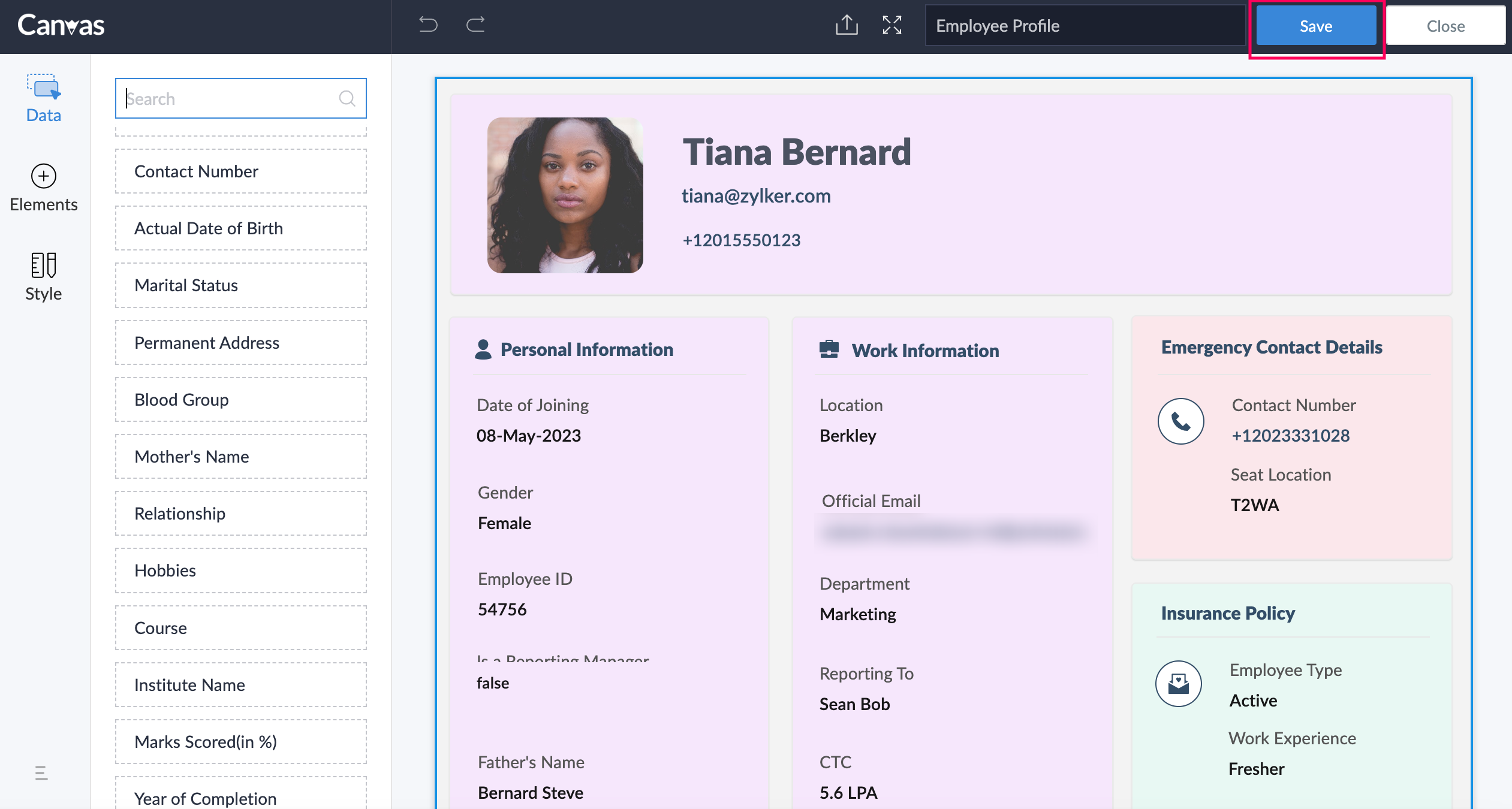 - When you drag and drop fields into the Canvas layout builder, the default field value will be populated (in preview) with the first record's value in your report.