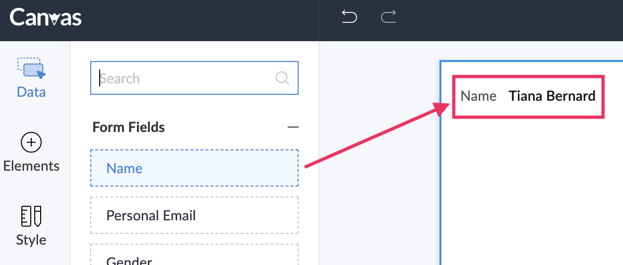 - In the Data module on the left, drag and drop the required fields (form and system fields) in the design area.