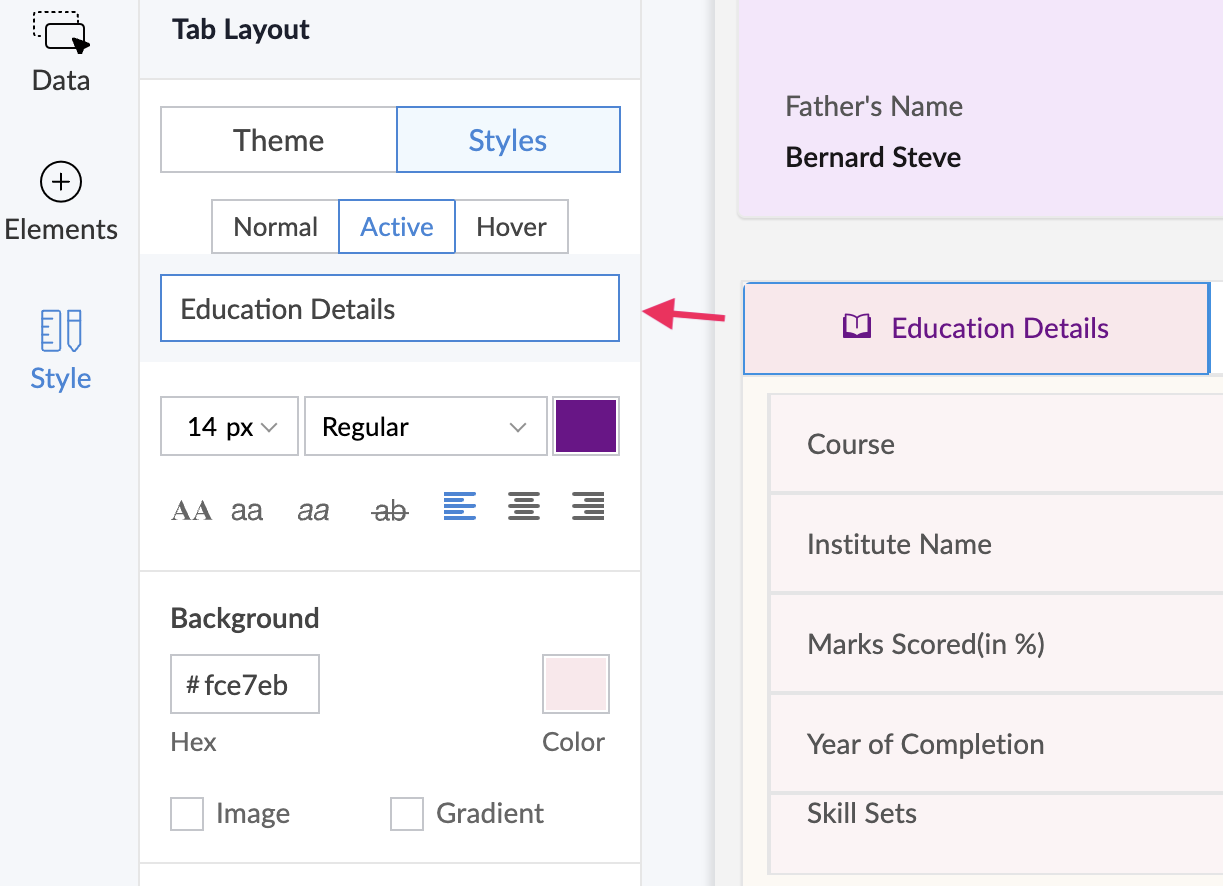 - To name your tab, click the required tab -> open the Style tab in the left panel -> enter a suitable name.