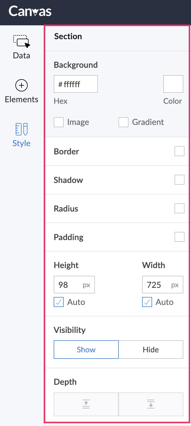 You can move elements forward or backward by using the Depth option under Style. Drag and drop the following elements from the menu on the left onto the design area.
