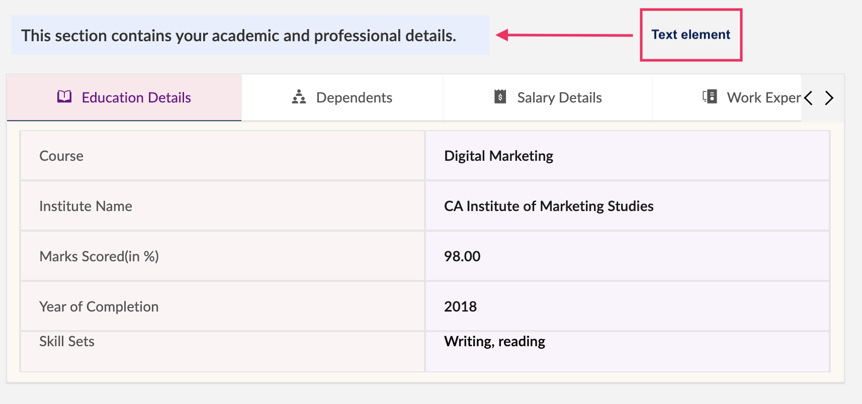 You can insert a text box element to enter the required content within the detail view. For example, you can use the text element to display a heading before starting sections or to add a note or disclaimer.
