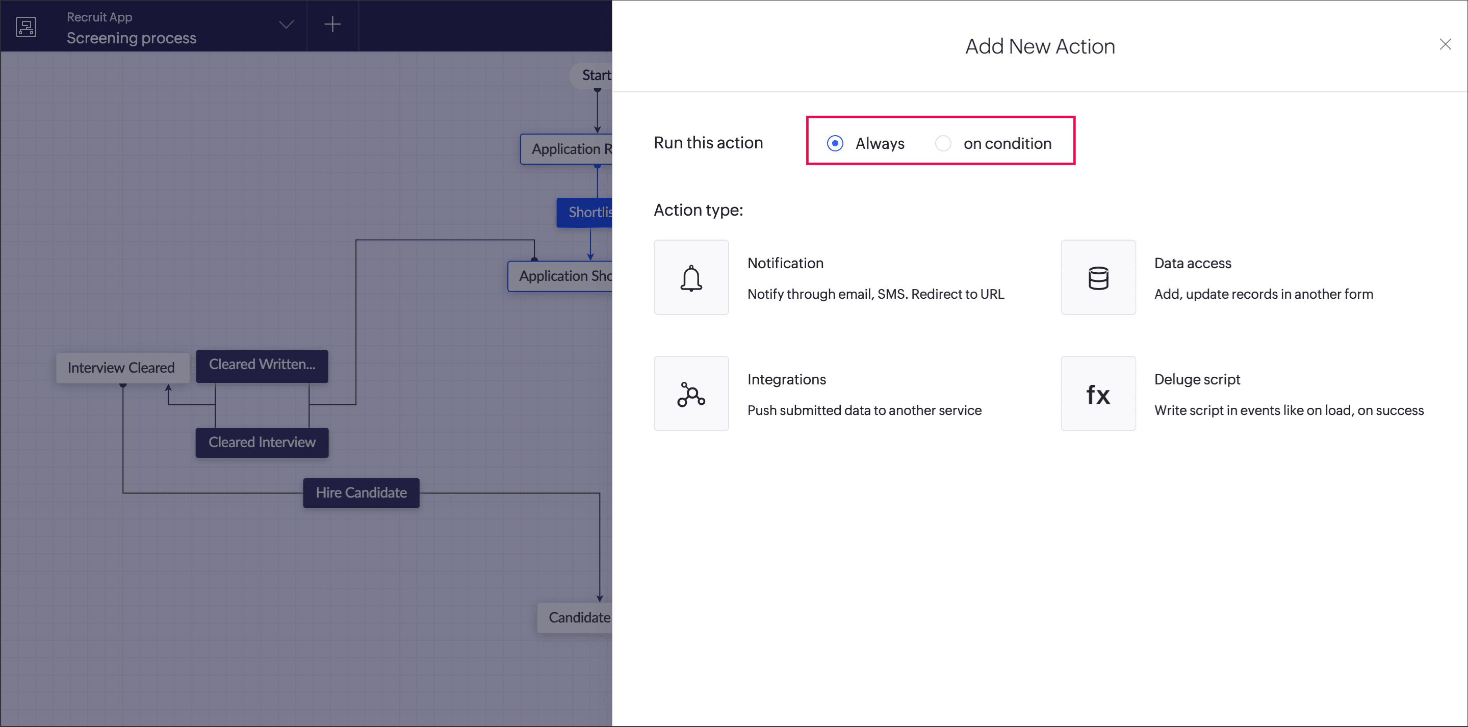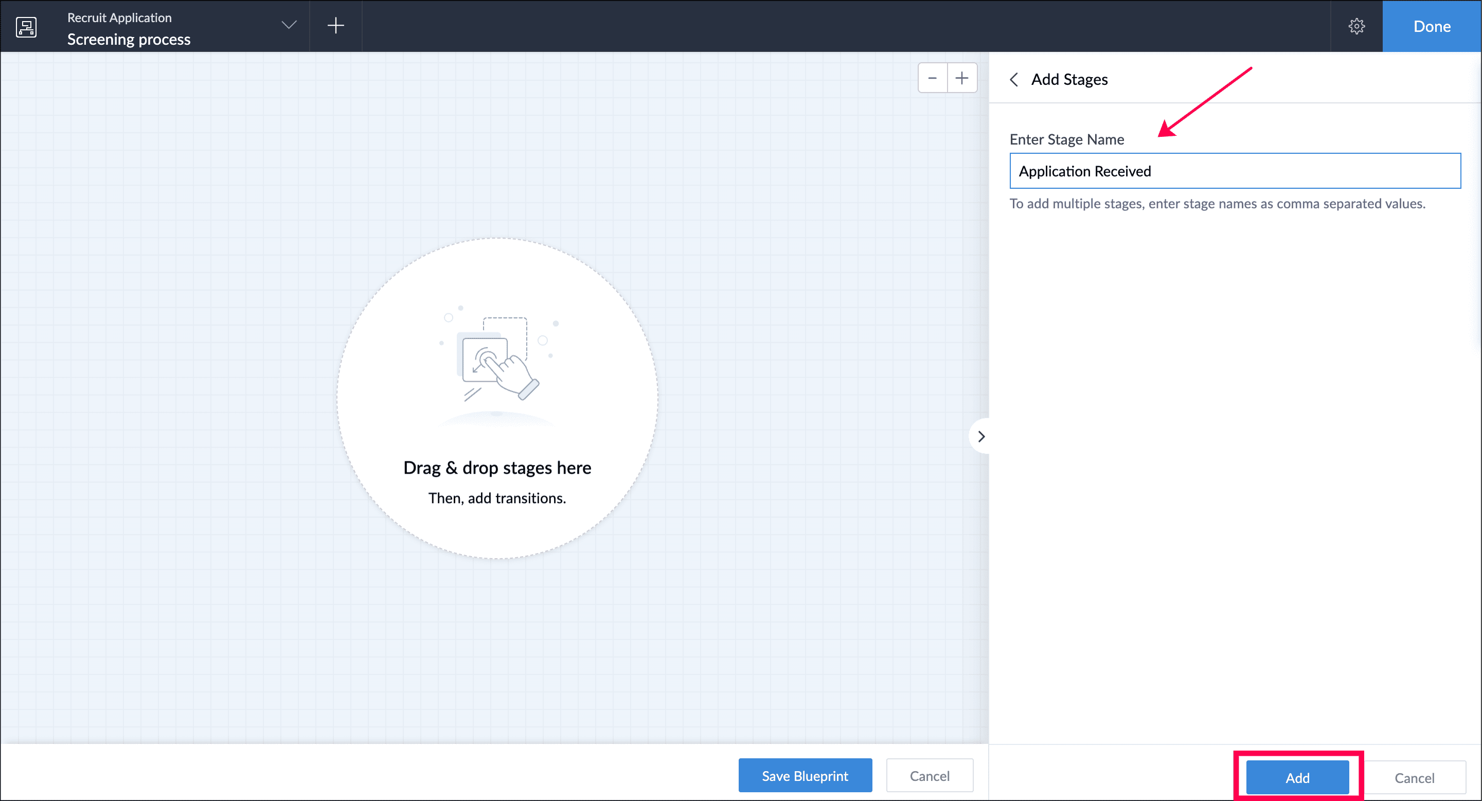 In this flow, each state (like Application Received, Candidate Shortlisted and Candidate Selected) is called a Stage and the trigger to move a record from one stage to the next is called a Transition. The transition is typically a button (example: Shortlist) that, when clicked by a user, moves the record to the designated next stage. Likewise, you can create a complete process flow using blueprint. Creating a blueprint is essentially designing this process by laying out the stages and defining transitions that connect them. It also lets you automate various actions in each transition.