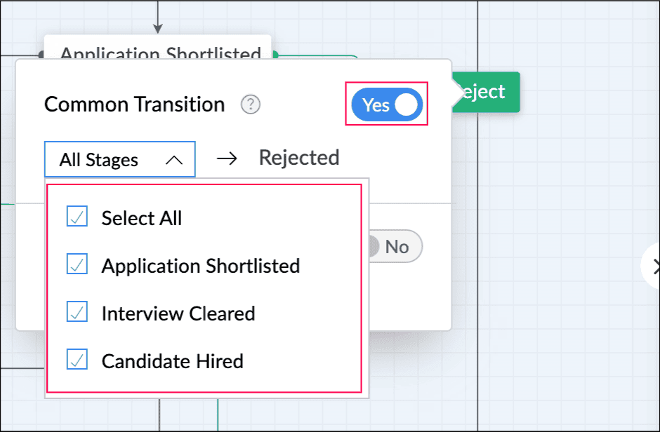 A common transition is a transition that will be commonly available from all or multiple stages of the blueprint. Making a transition common will be useful for cases like Reject or Cancel. For example, a candidate can be Rejected at any level of the screening process and so the Reject transition must be available from all the stages.