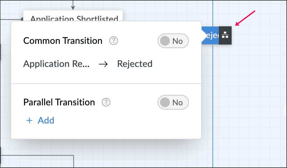 Hover over any transition to make it a common or parallel transition. A common transition will be available from all or multiple stages of the blueprint (For example: Reject). A parallel transition allows a record to move from one stage to another only when multiple transitions are fulfilled. (For example: Clearing multiple interviews)