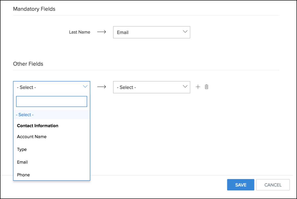 2. Other fields - You can map fields in the chosen Salesforce action to the fields in your Zoho Creator form. This is optional. Click Add icon to map more fields.