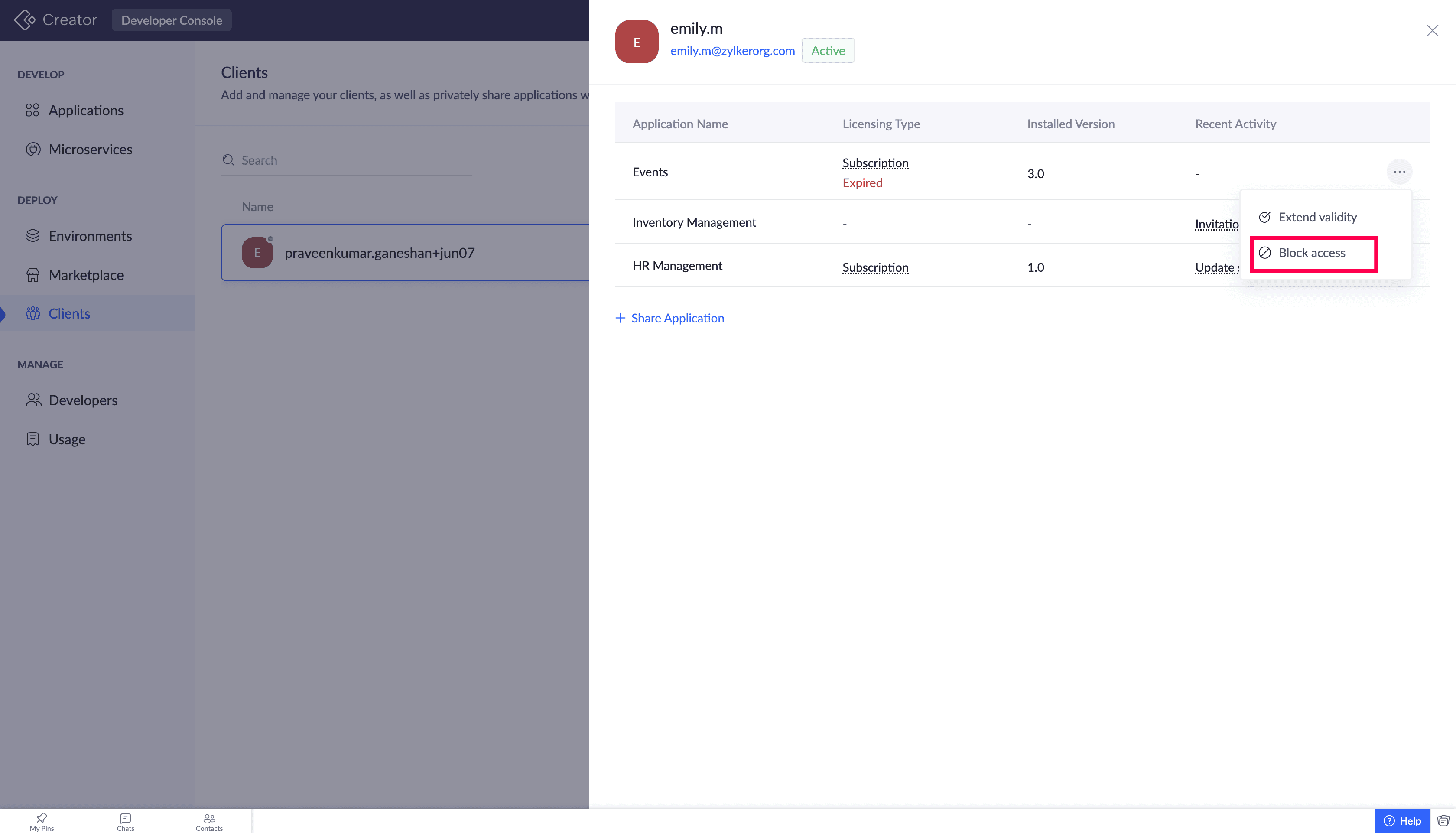 After you've shared your application with a client, as the super admin or developer of your account, you can manage its lifecycle and access through the following actions:
