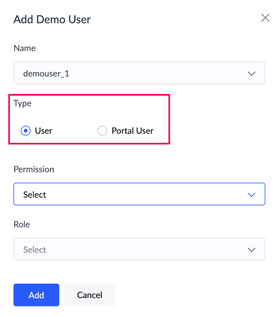 Note: If the Type is selected as User, we can assign the permissions and roles configured in the app. If the Type is selected as Portal Users, we can assign the portal permissions configured in the app.