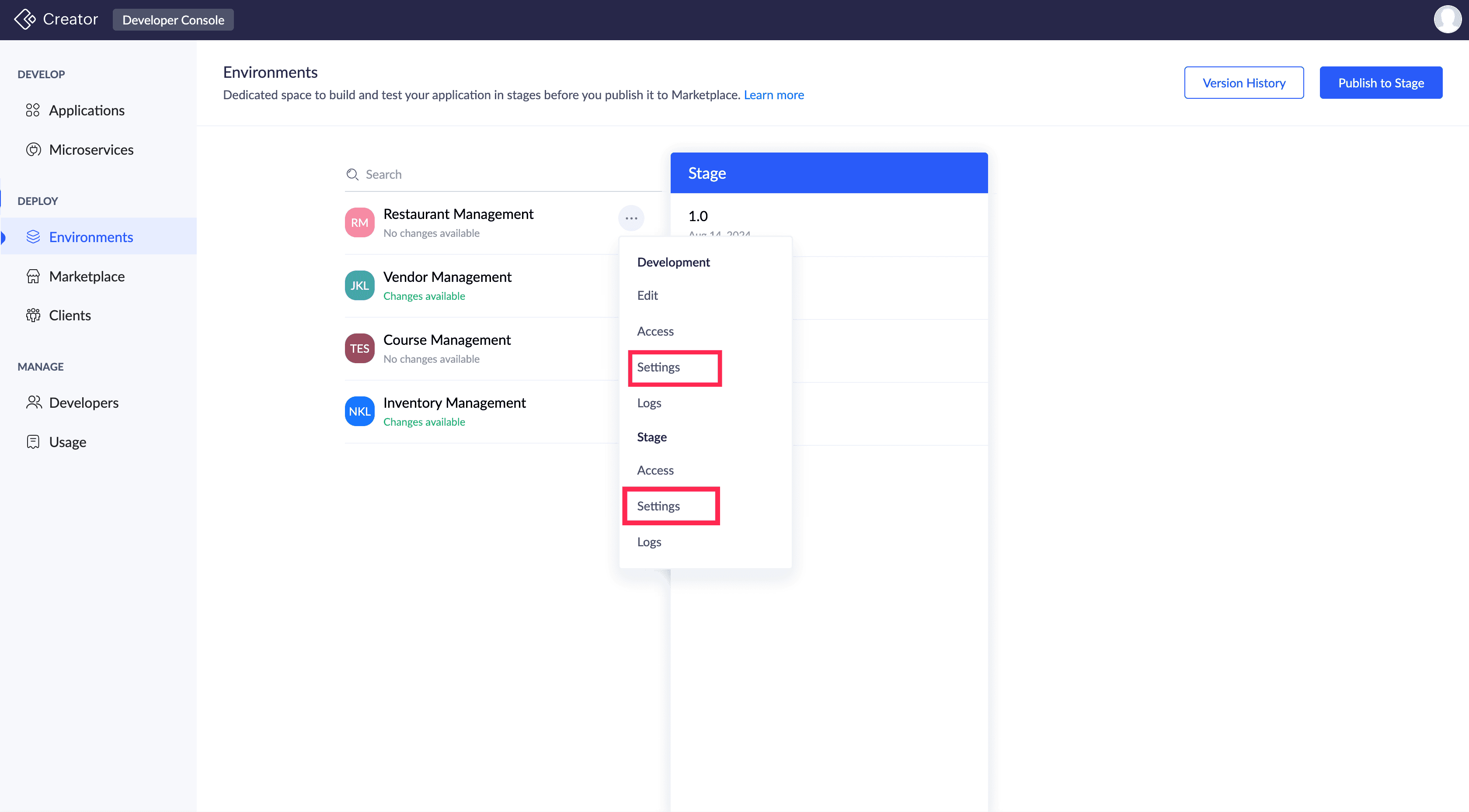 Note: All settings options will only be applied to the selected environment. For example, if you click Settings under Development, all configurations will only be applied to the Development environment, and vice-versa for the Stage environment.