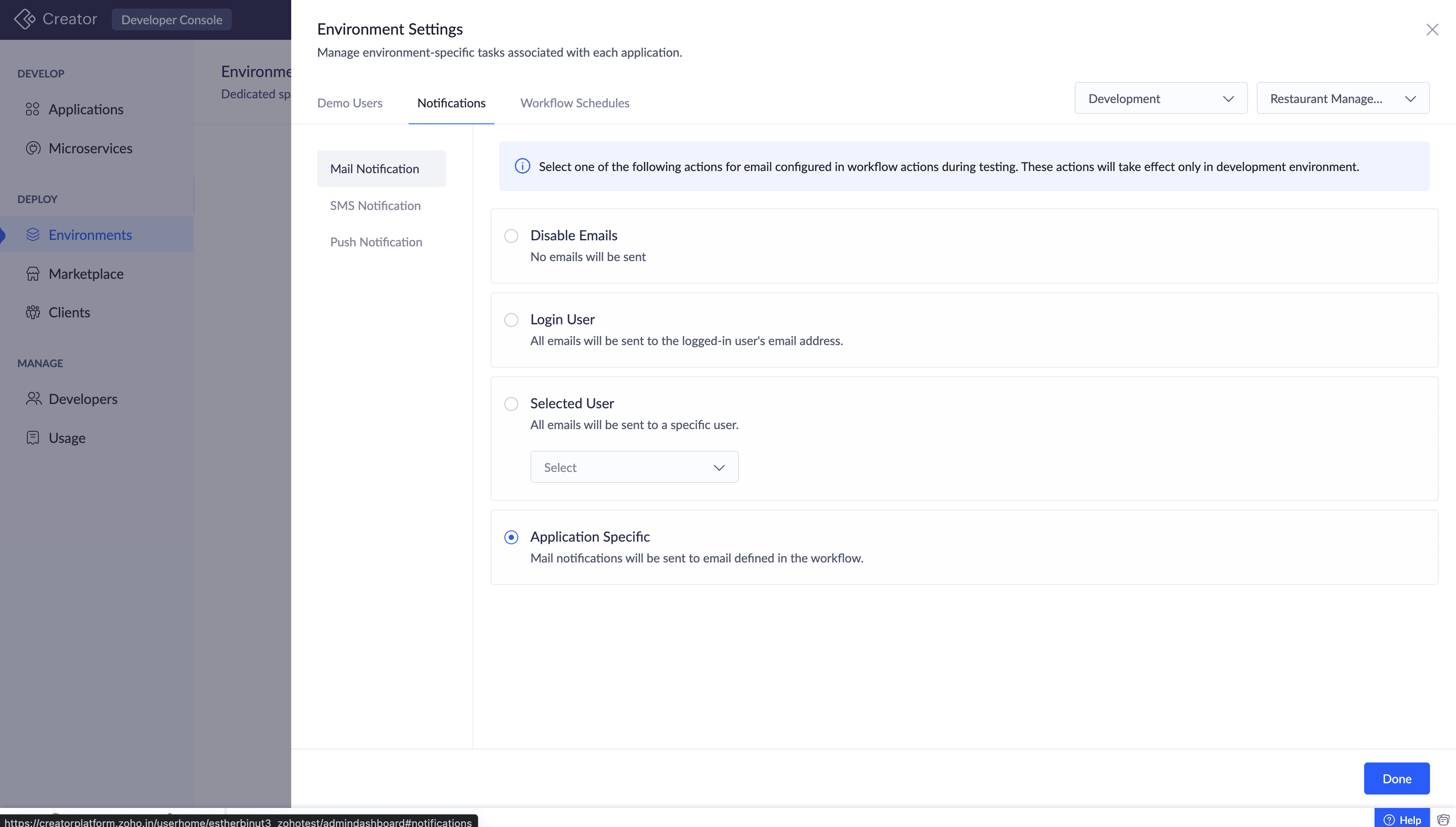 As the Development and Stage environments are used for testing purposes, there may not be a need for notifications to be triggered when the app is being tested. This section lets you decide to disable or route the notifications to any particular address.