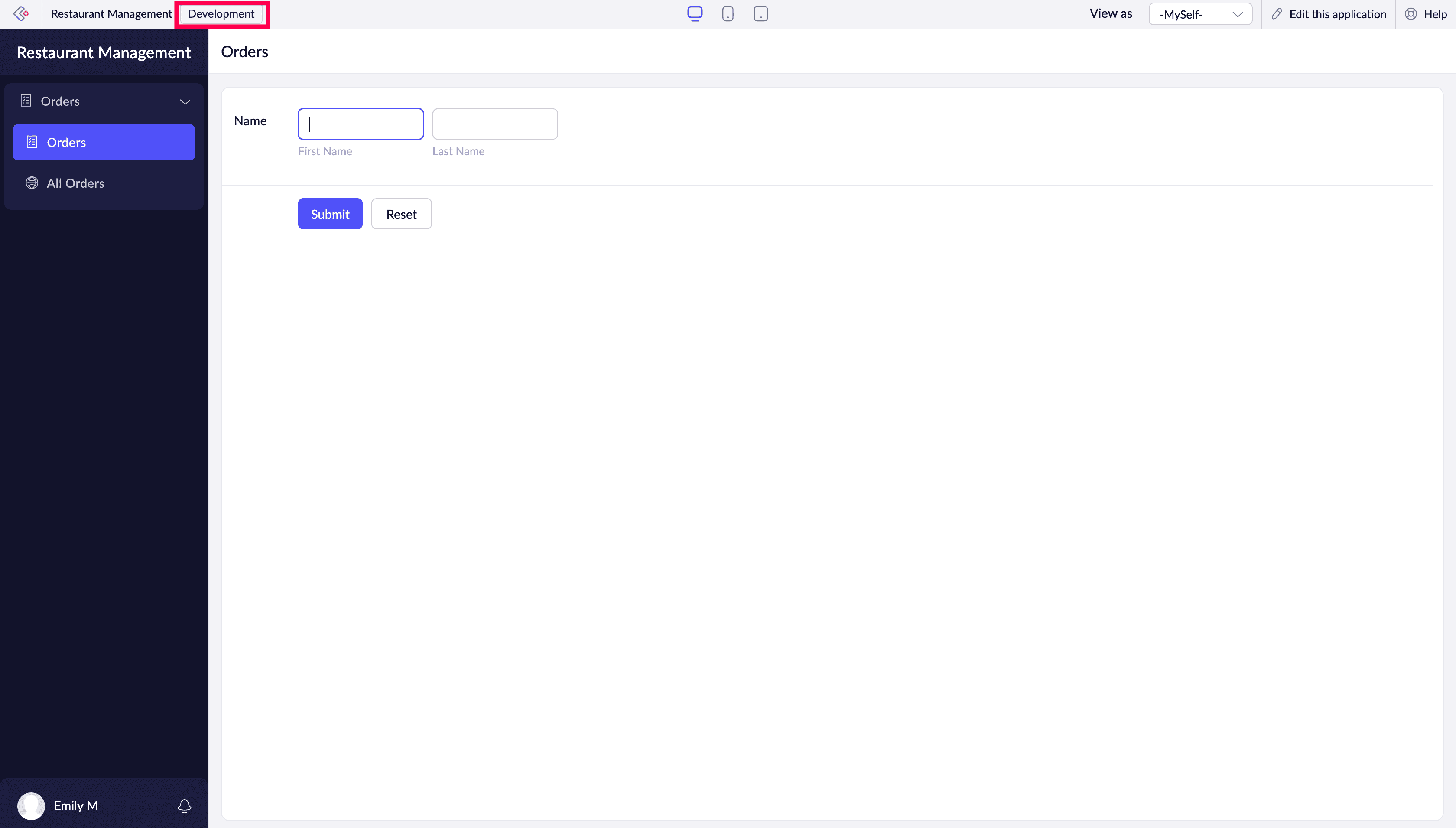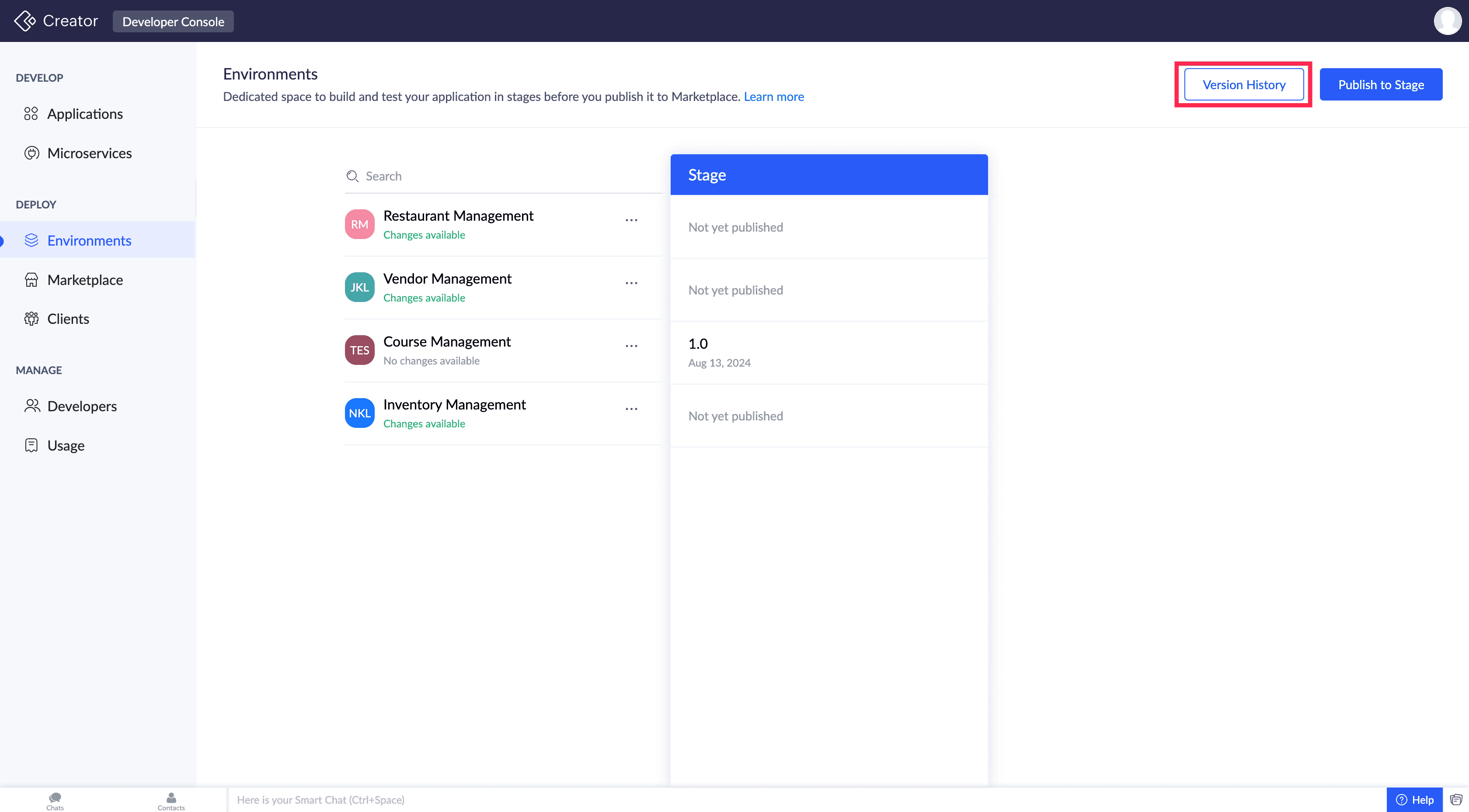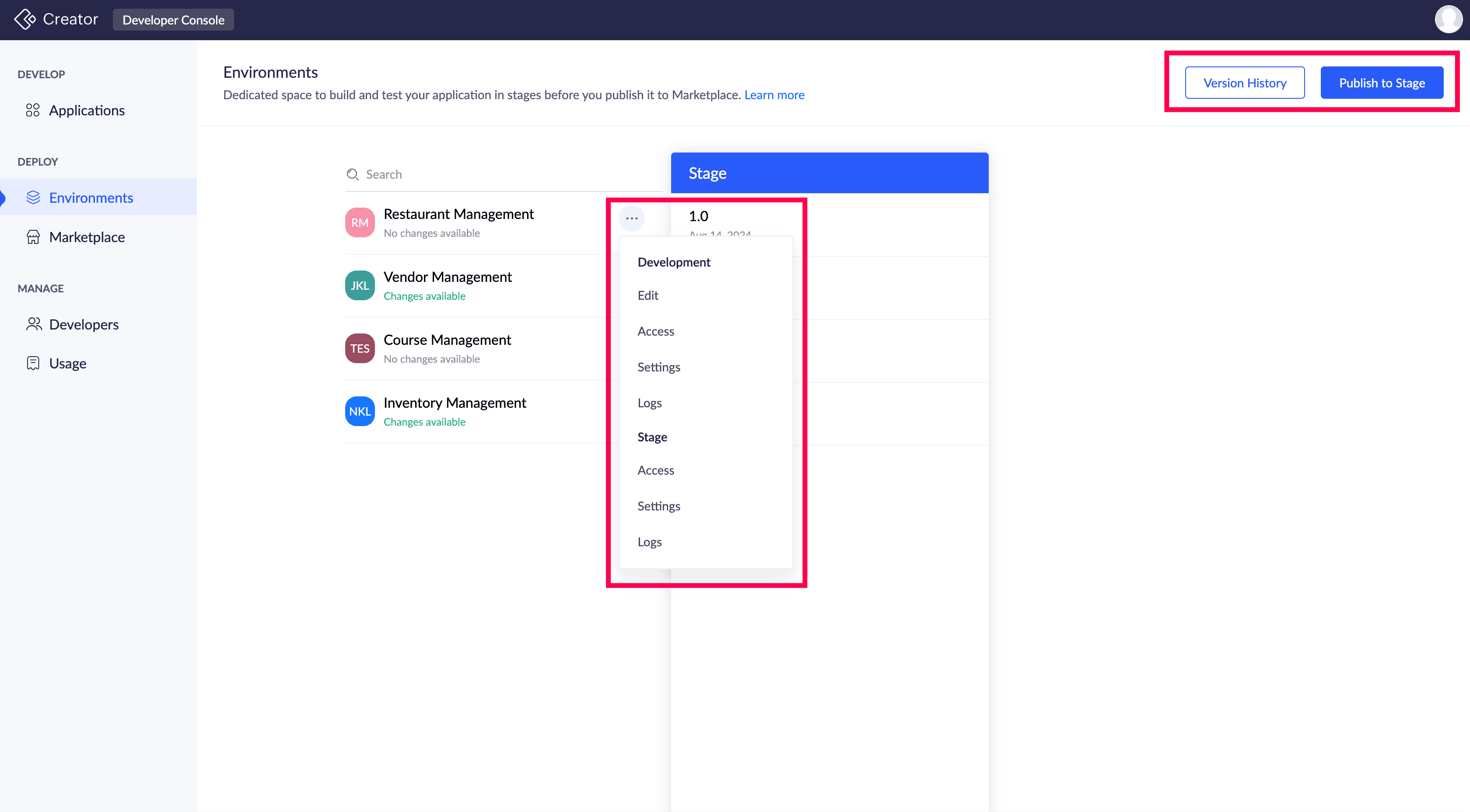 The Edit option is available only for the Development environment, as applications can only be edited in the Development environment. Clicking this option takes you to the edit mode of the application to make any required changes.