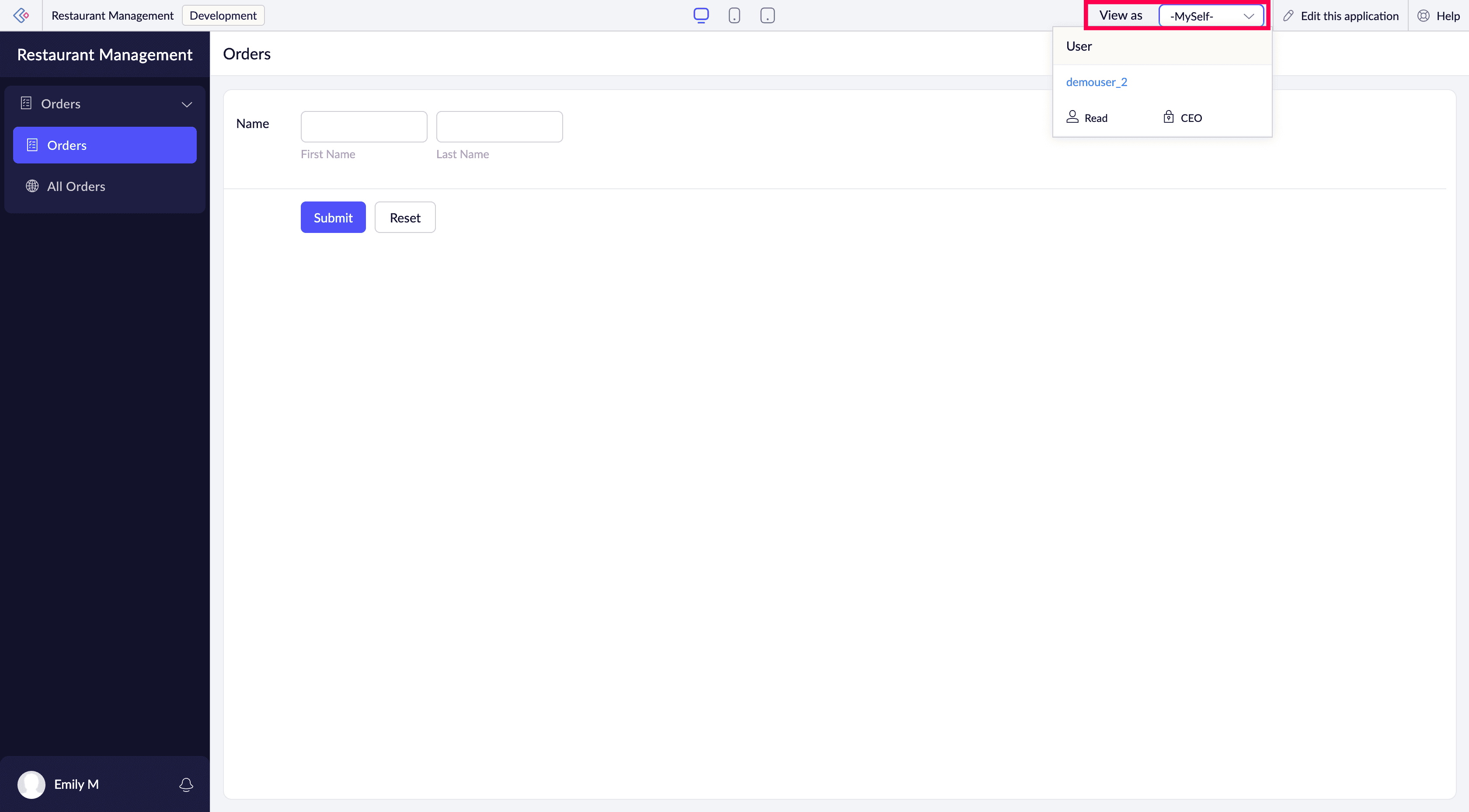 Under the View as field in the top bar, you have the option to test the application as a demo user. You can learn about demo users in the upcoming section.