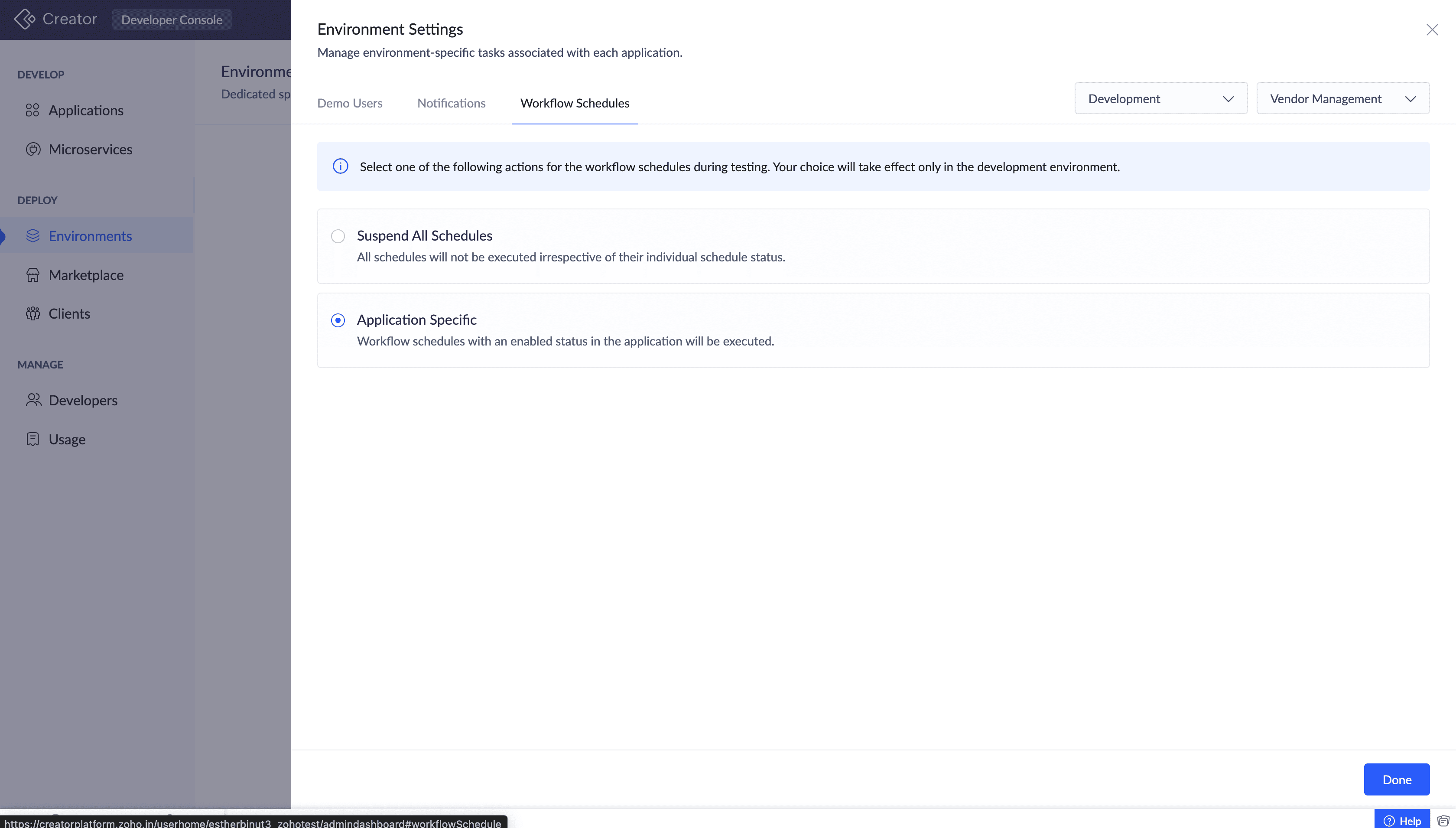 You might have configured schedules in your application. But once you've validated or tested the configured schedules, you may no longer need them to execute continuously during the testing phase. You can suspend the execution of all configured schedules by choosing one of the two options below: