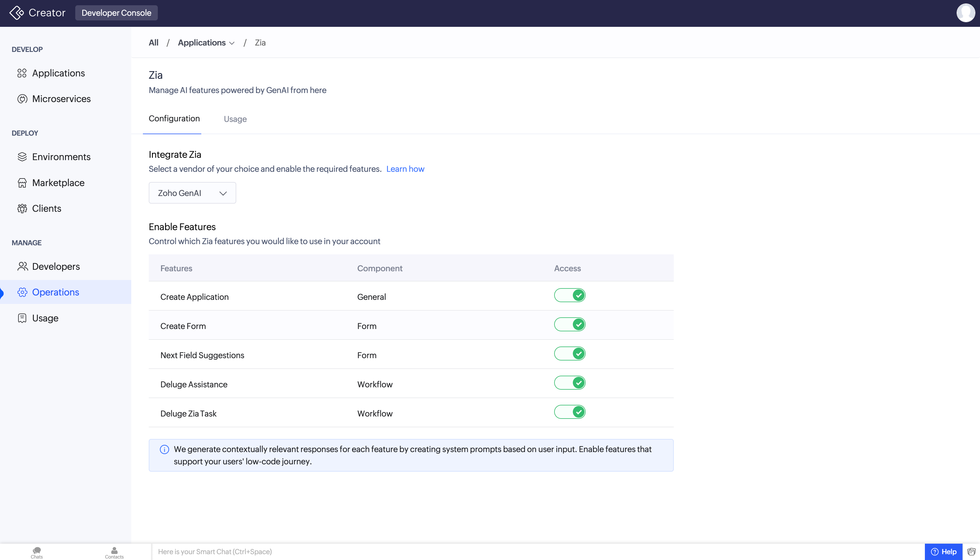 Learn about the Operations module in the Zoho Developer Console and the features available to manage support access, system integrations, AI capabilities and other features to help better your applications.
