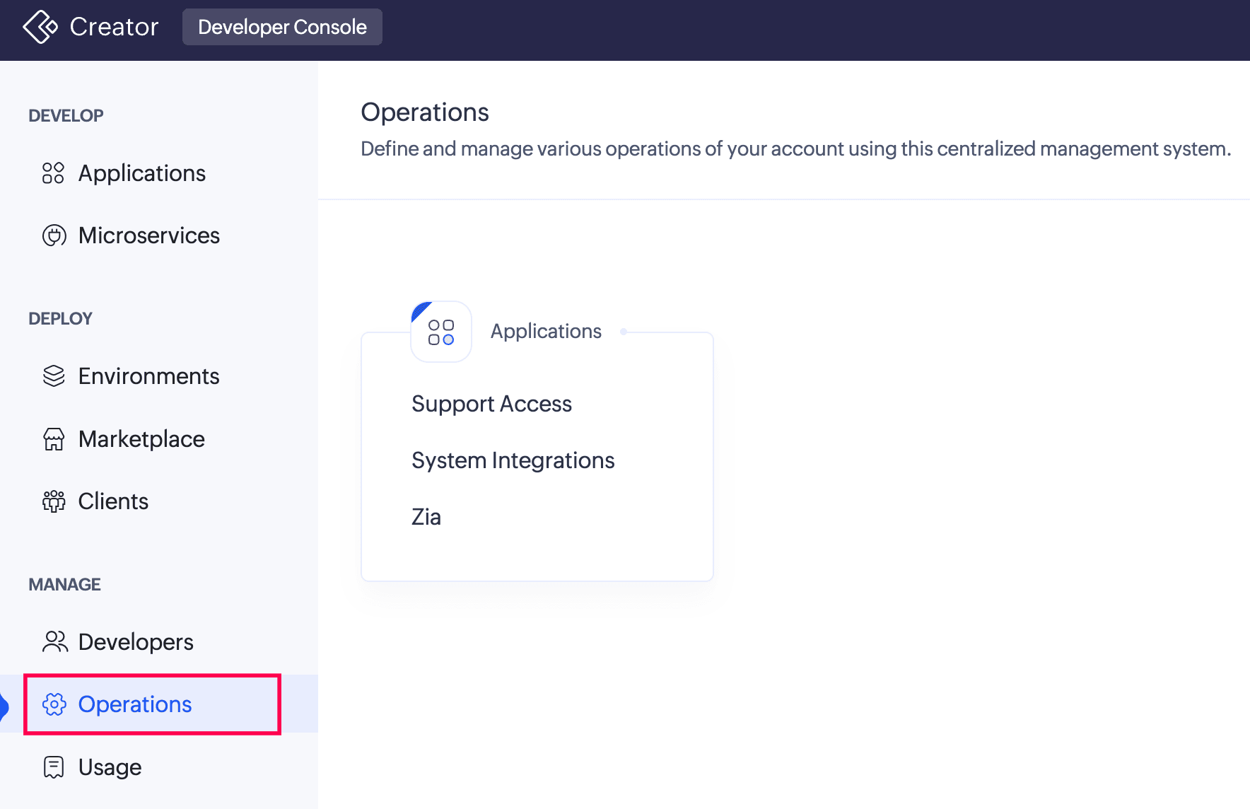 The Operations page provides super admin with access to tools required to manage application-level support, integrations with Zoho services, and AI-assisted development features within the Developer Console.