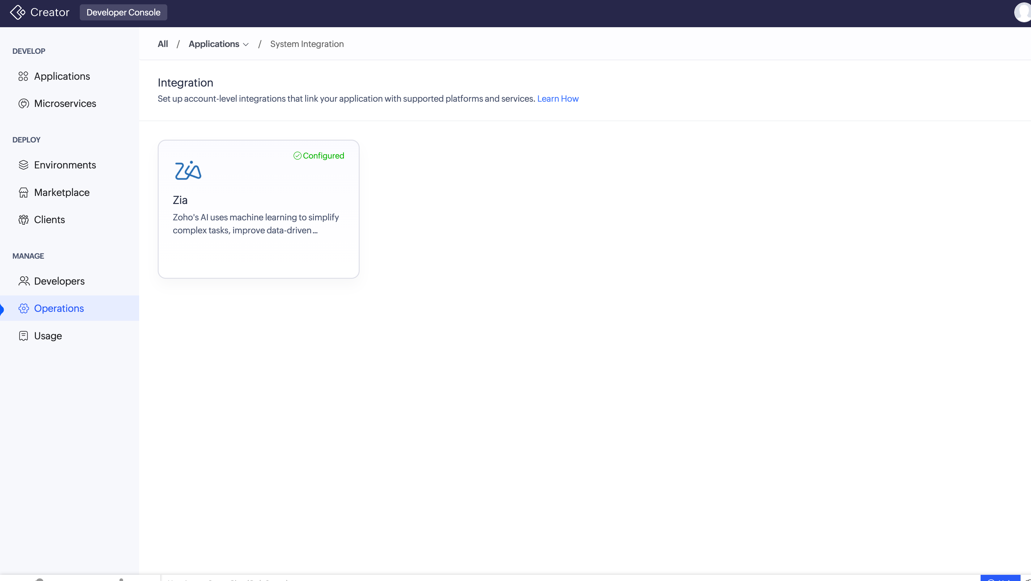 For example, when you need to connect your application to specific Zoho services, use System Integrations in Operations to view available built-in integrations and enable or disable them as required, ensuring only the necessary services are active and centrally managed.