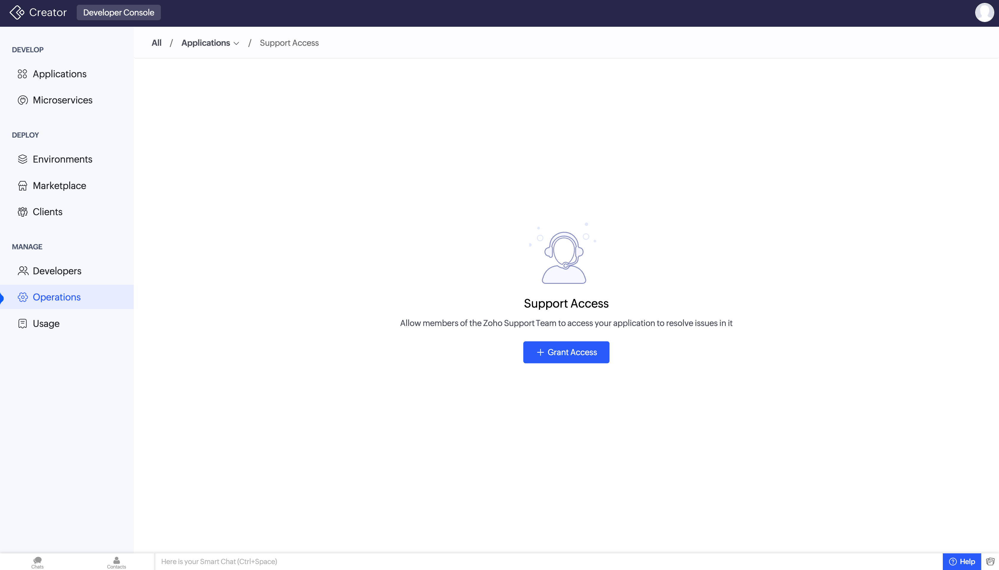 This ensures secure and controlled collaboration with the Zoho support team. Learn moreFor example, when an application built in Zoho Developer Console encounters unexpected behavior, you can use Support Access in Operations to grant the Zoho Support team a time-bound access to the application for investigation and fixes, without exposing account-level data or keeping access open longer than necessary.