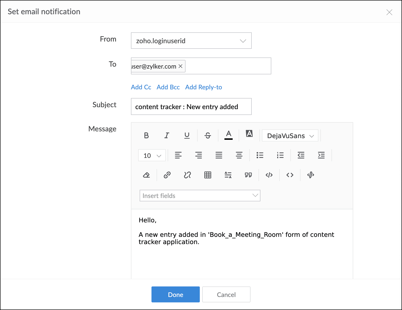 You can set the sender's email address, recipient addresses (To, Cc, Bcc, Reply-to), email subject, and message content. You can even include user-submitted data and use templates to format the email. Learn more about