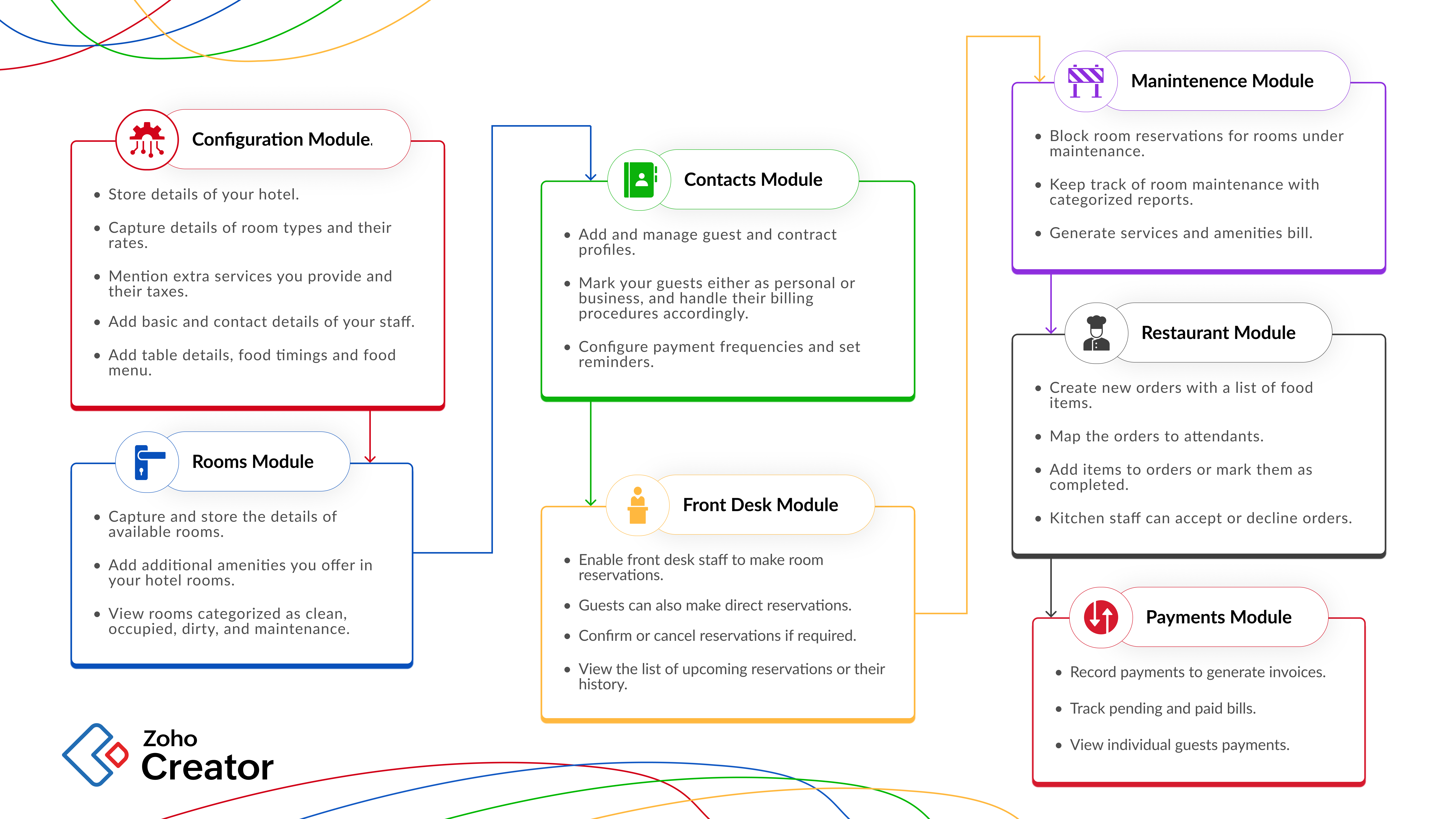 Say goodbye to thick registry books and run your hospitality services on our app! This robust hotel management software enables you to streamline your hotel operations while also ensuring a memorable experience to your guests. You will be able to maintain and track your employee details and guest details, keep tabs on reservations and check in and check out times, facilitate guests to raise issues and complaints with the management, generate bills, enable payments, and much more. With separate modules dedicated to everything from maintenance and room service requests to payment reminders, you can sit back and manage all your day-to-day operations from a single, consolidated hotel management solution.