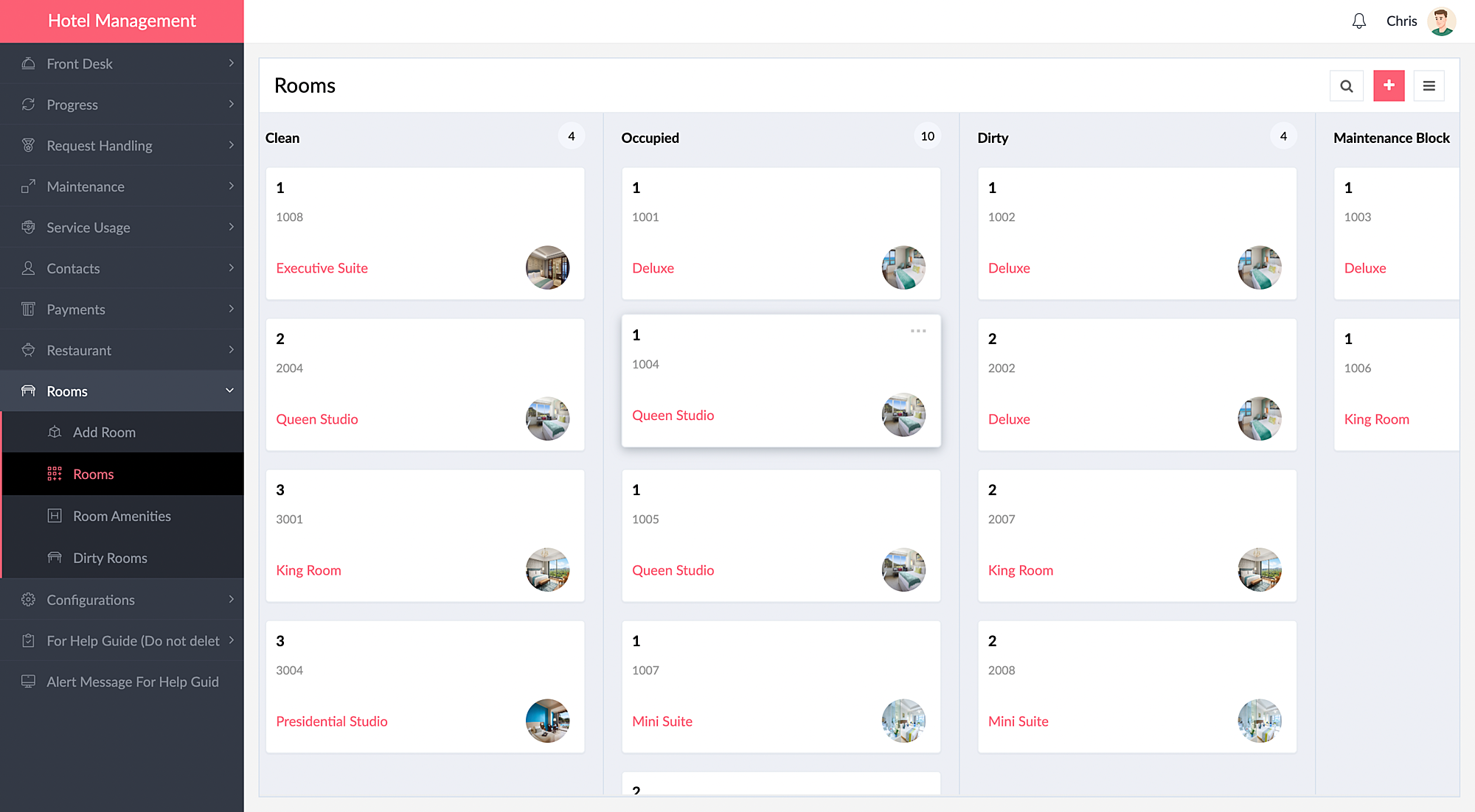 This comprehensive hotel management application provides a user interface with separate modules that allow you to store guests' details, streamline payments, check patrons in and out with a single click, manage maintenance requests, and much more.