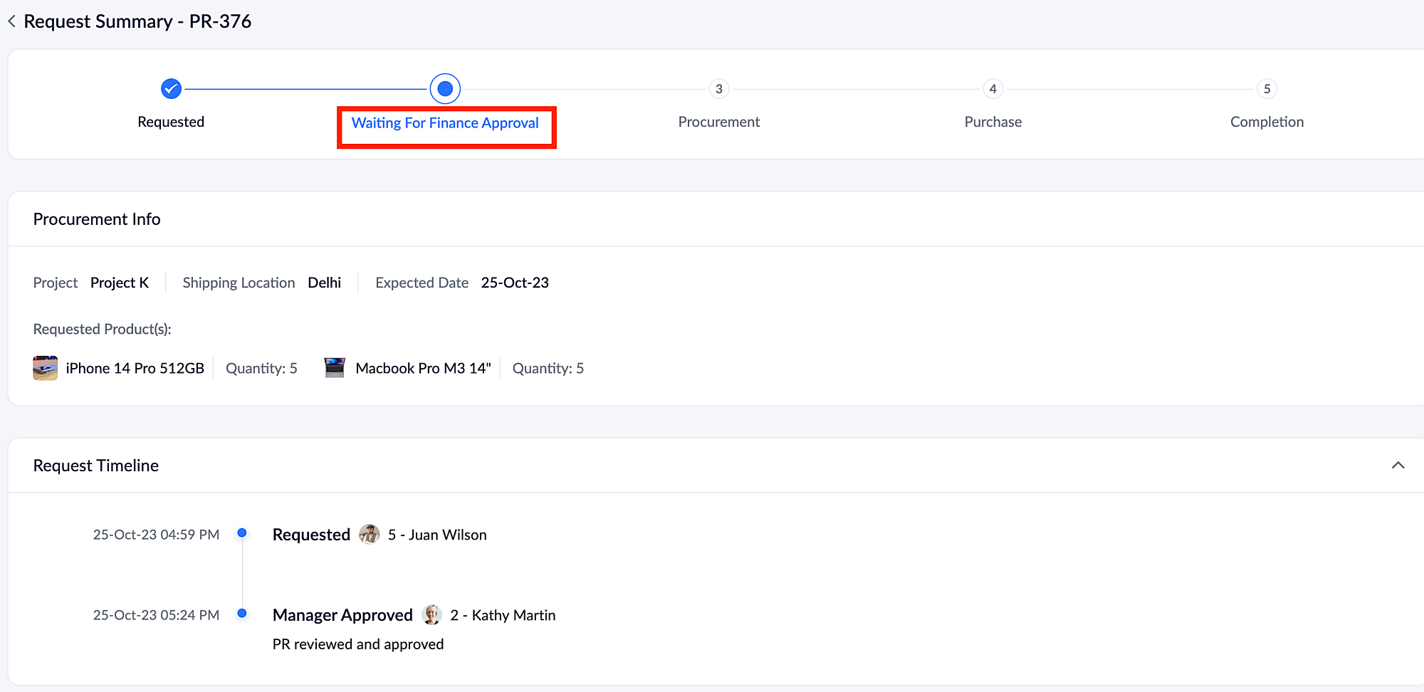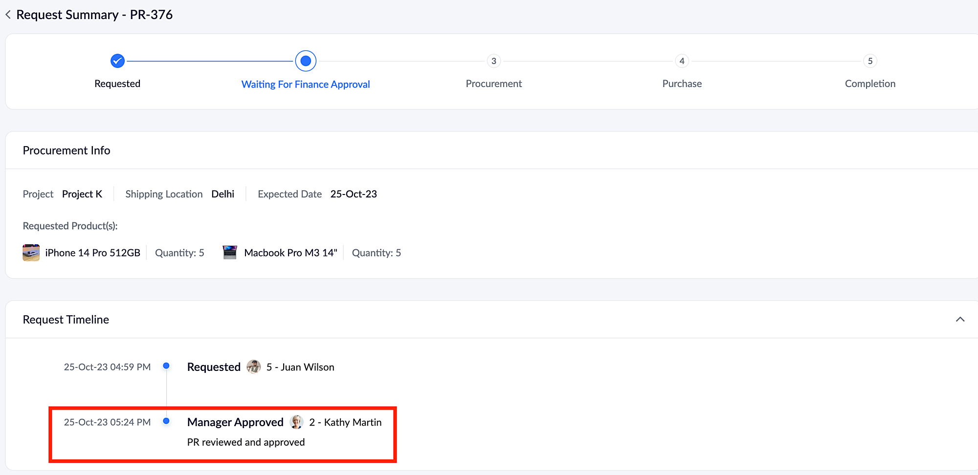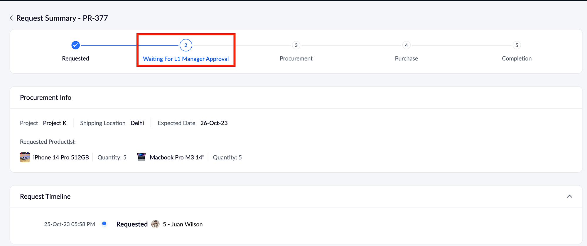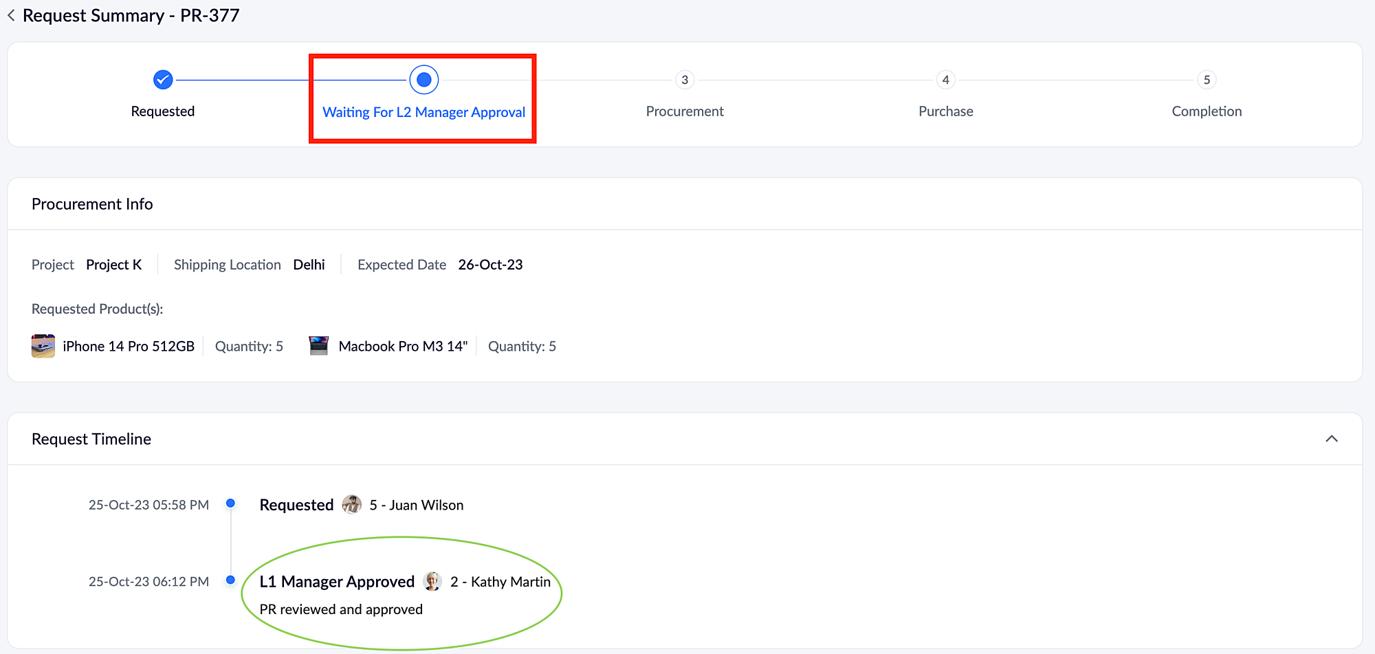 4. Once the PR is approved by the L1 manager, it goes for L2 manager approval and the process proceeds further. This status change can be tracked from the request timeline.
