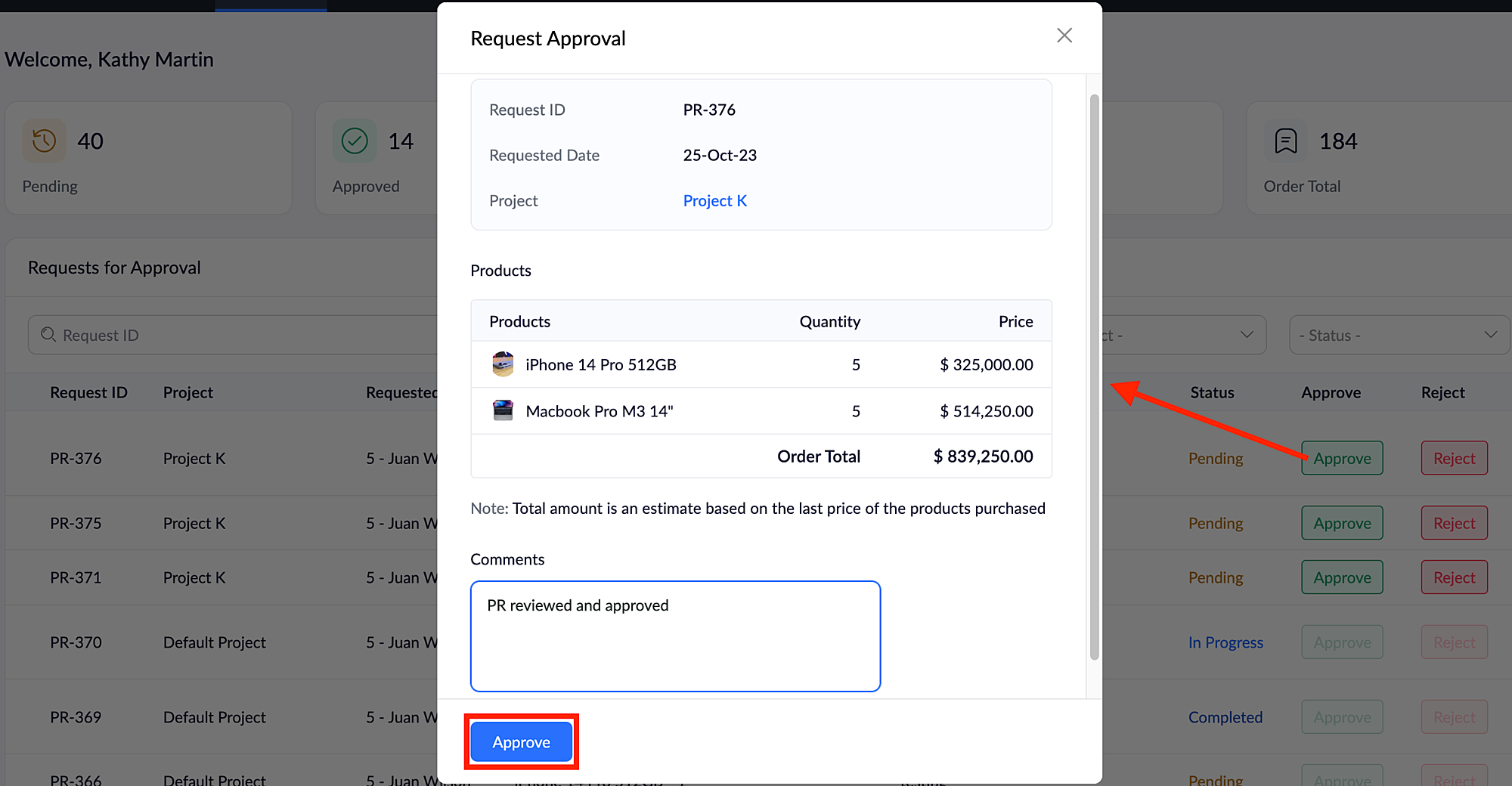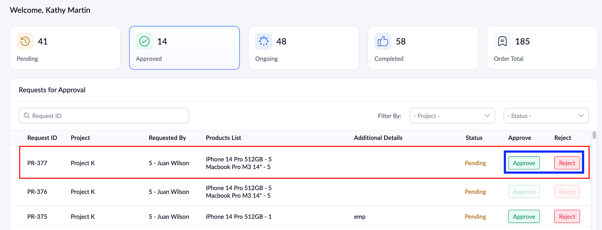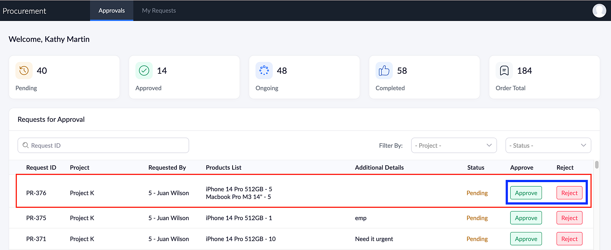 1. A manager needs to navigate to the Approvals tab, which will show the list of requests for approval. At this point, the manager has the option to either approve or reject the PR.