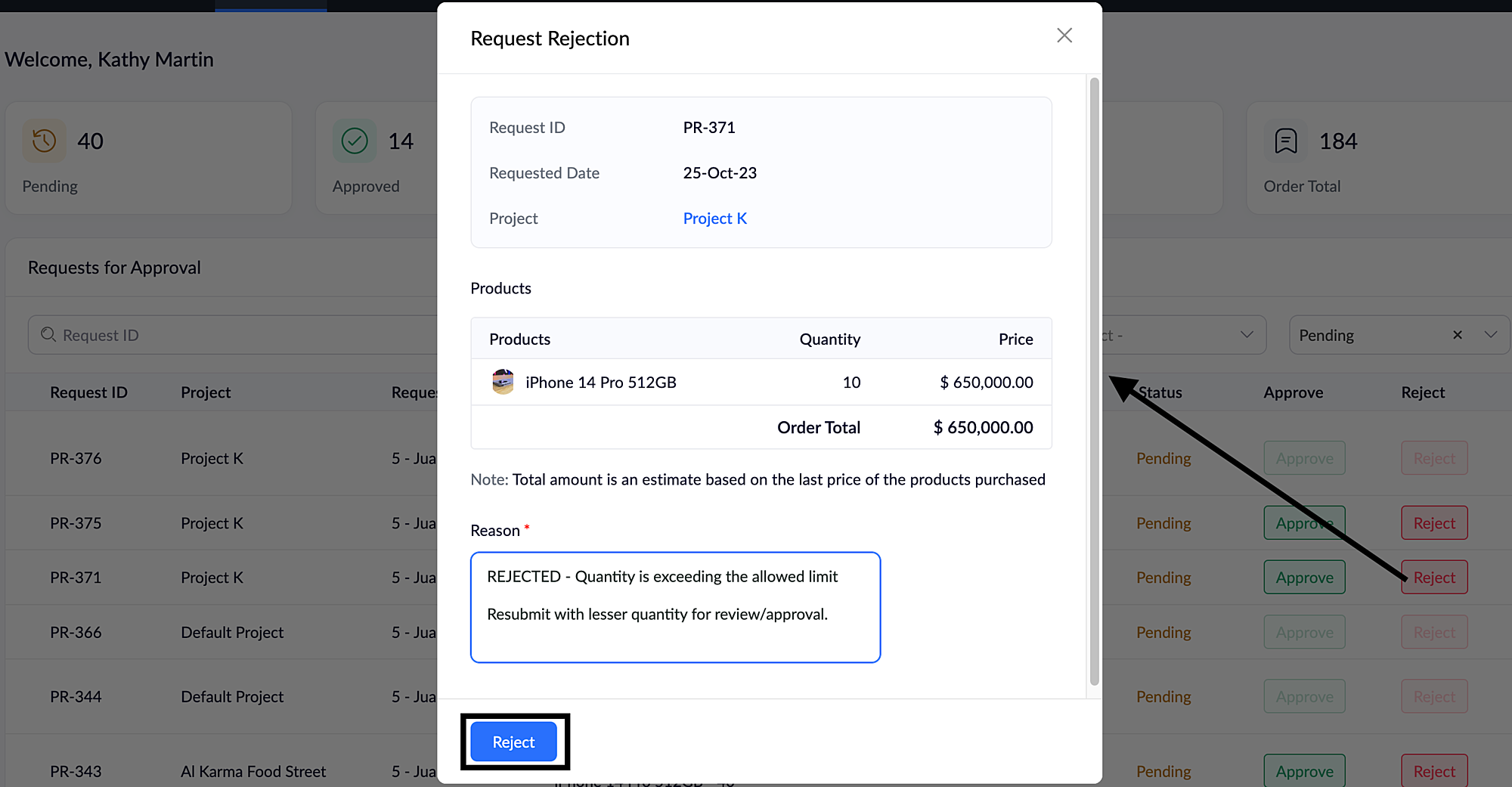 Similarly, the PR can be rejected as well. The Comments section will be replaced with the Reason section, where the manager will provide the reason for rejecting.