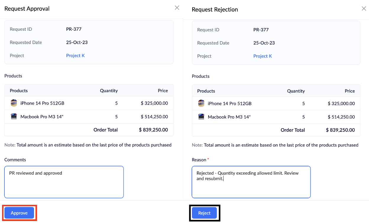 3. Upon clicking on Approve or Reject, you will be taken to the respective popup to complete the action as shown in the below image.