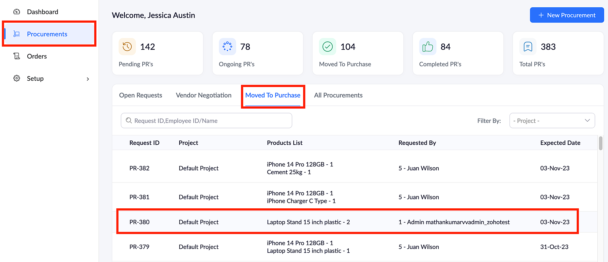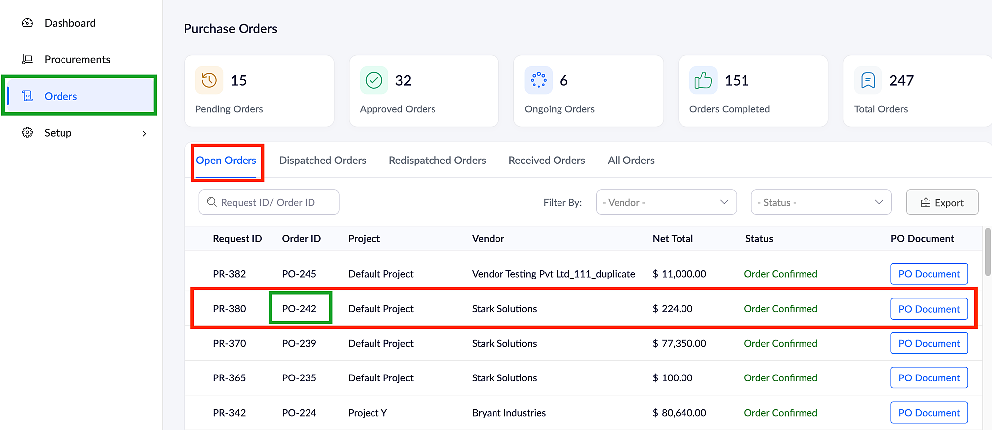 In the Open Orders tab, you can find list of PRs associated with its POs, such as PR-380 -> PO-242.