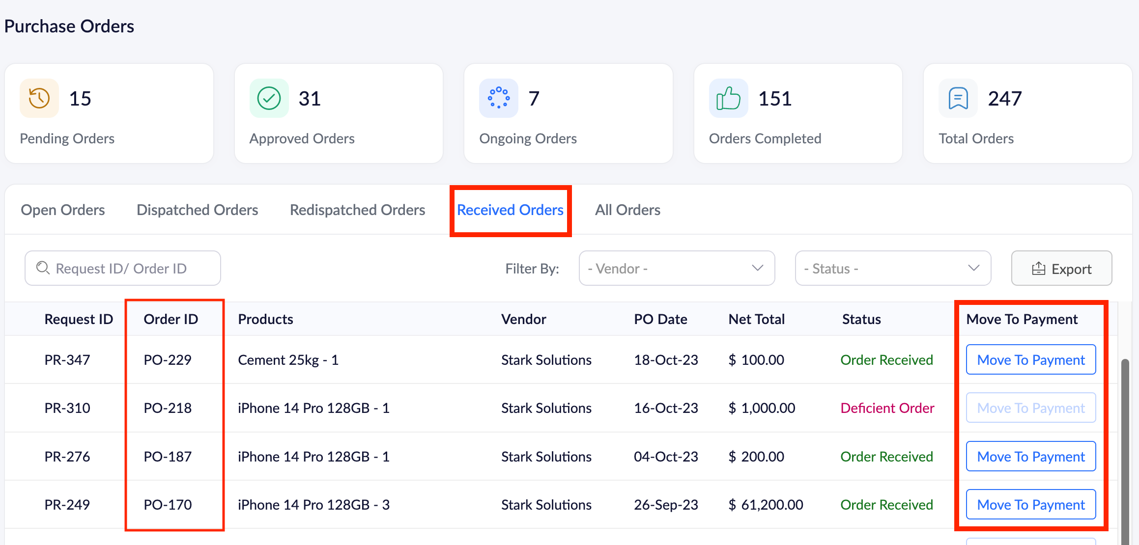 7. The Received Orders tab will allow you to see the list of all the POs processed and ready for payment.