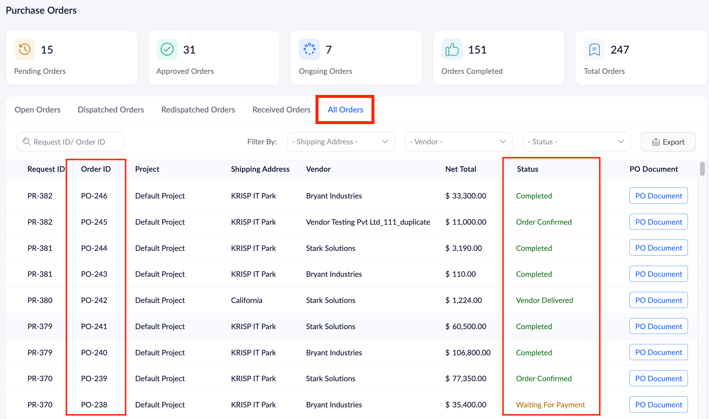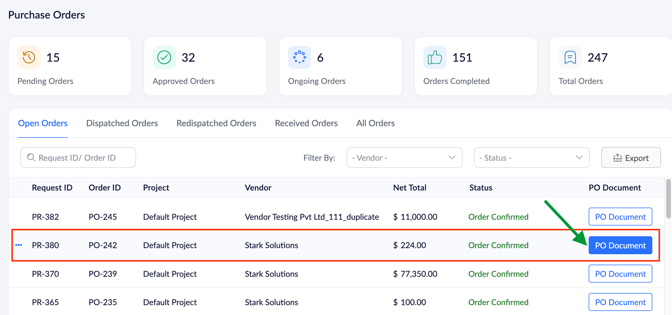 2. In this instance, for PO-242 you can see the status as Order Confirmed and a PO Document button is enabled.