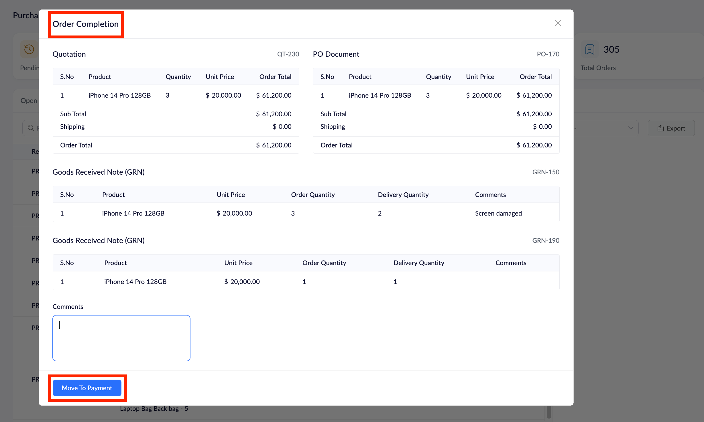 You can view the quotation, PO details and add comments (If any). Then click on Move To Payment.