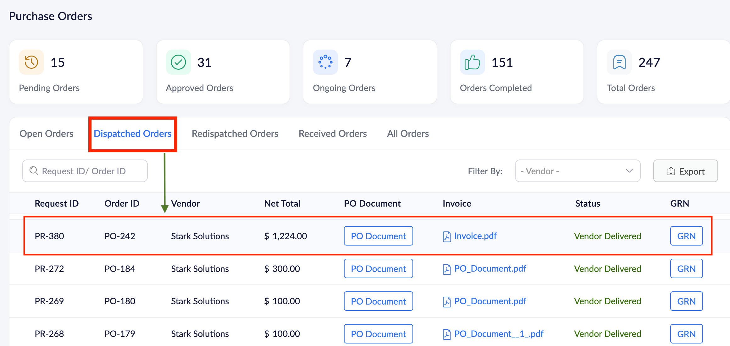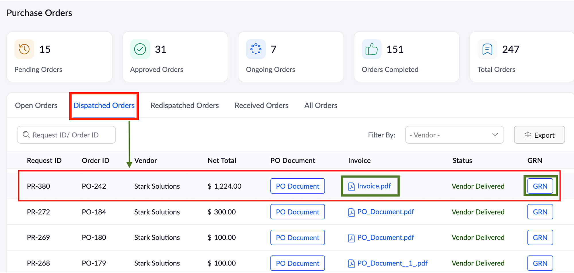5. To verify the dispatched order's Good Received Notes, click on GRN and click on Invoice.pdf to view details about the payment made.