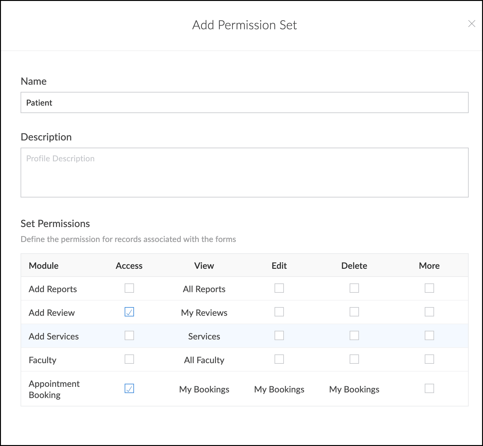 "Patient" | Is the TEXT that represents the name of the permission that needs to be given to the user. |