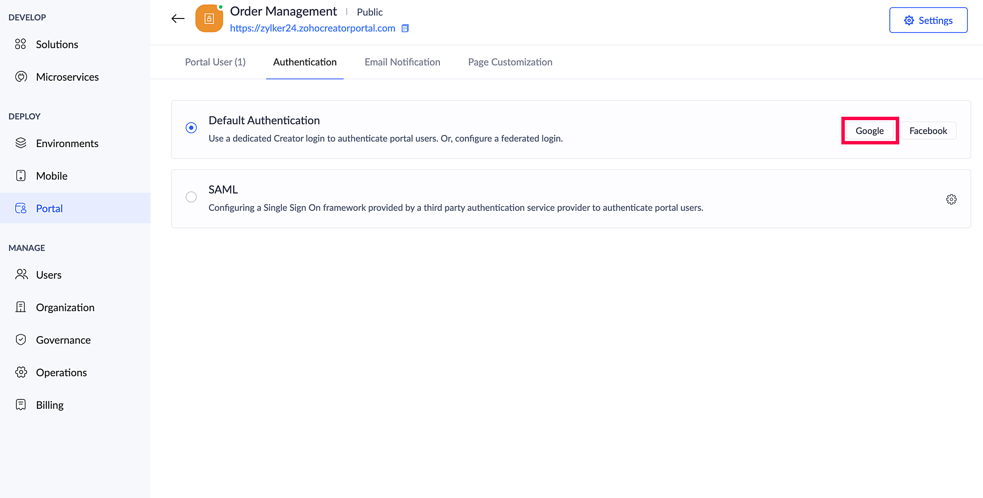 Zoho Creator portal. Customers can create their logins and sign into the portal using their email addresses or using their Google accounts. Creating logins gives them access to a dedicated internal system where they can place and track orders, view purchase history, etc.