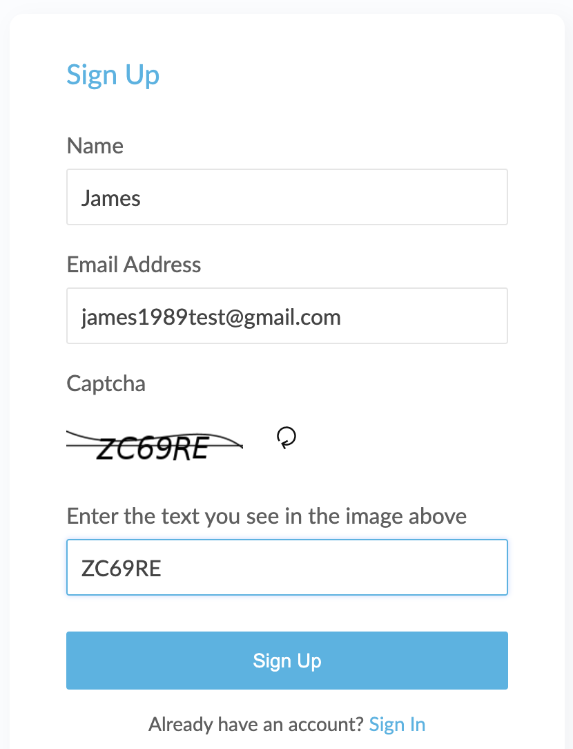 5. When a customer accesses the link, provides his information and clicks Sign Up, an email will be sent to the registered email address. Customer can use the link in the email to set up an account.