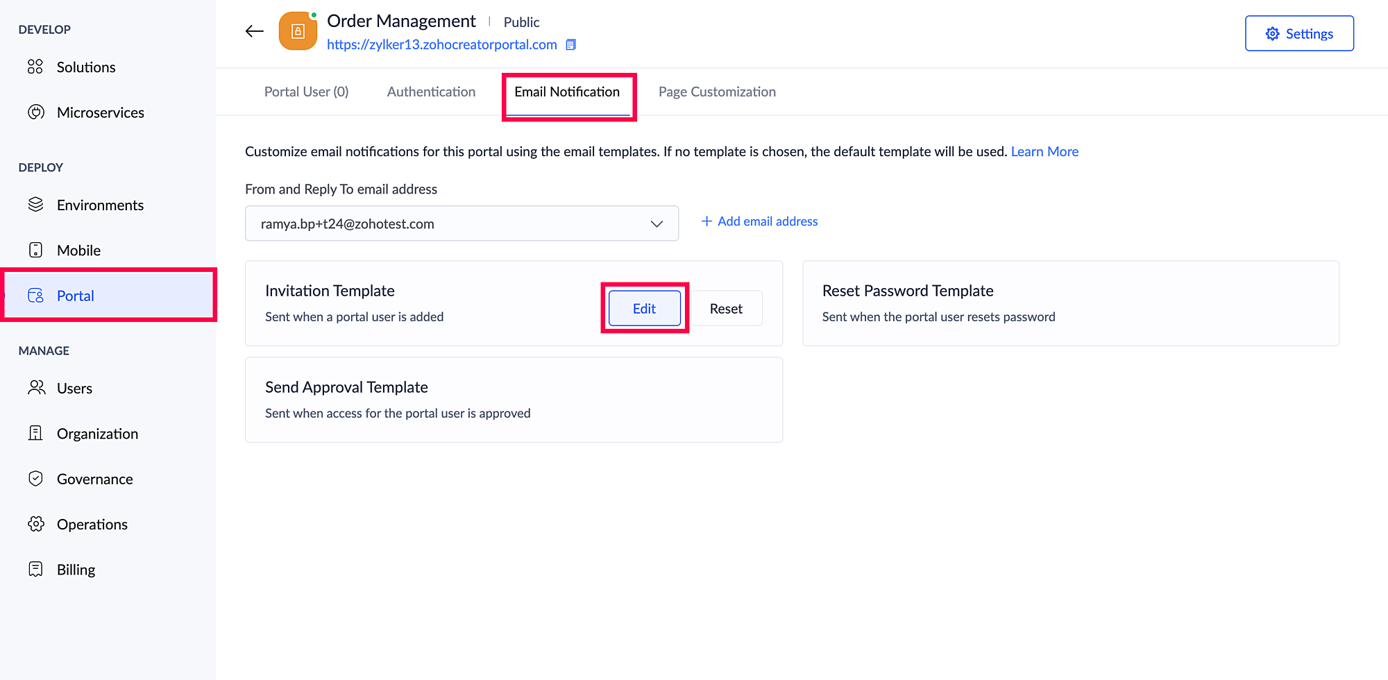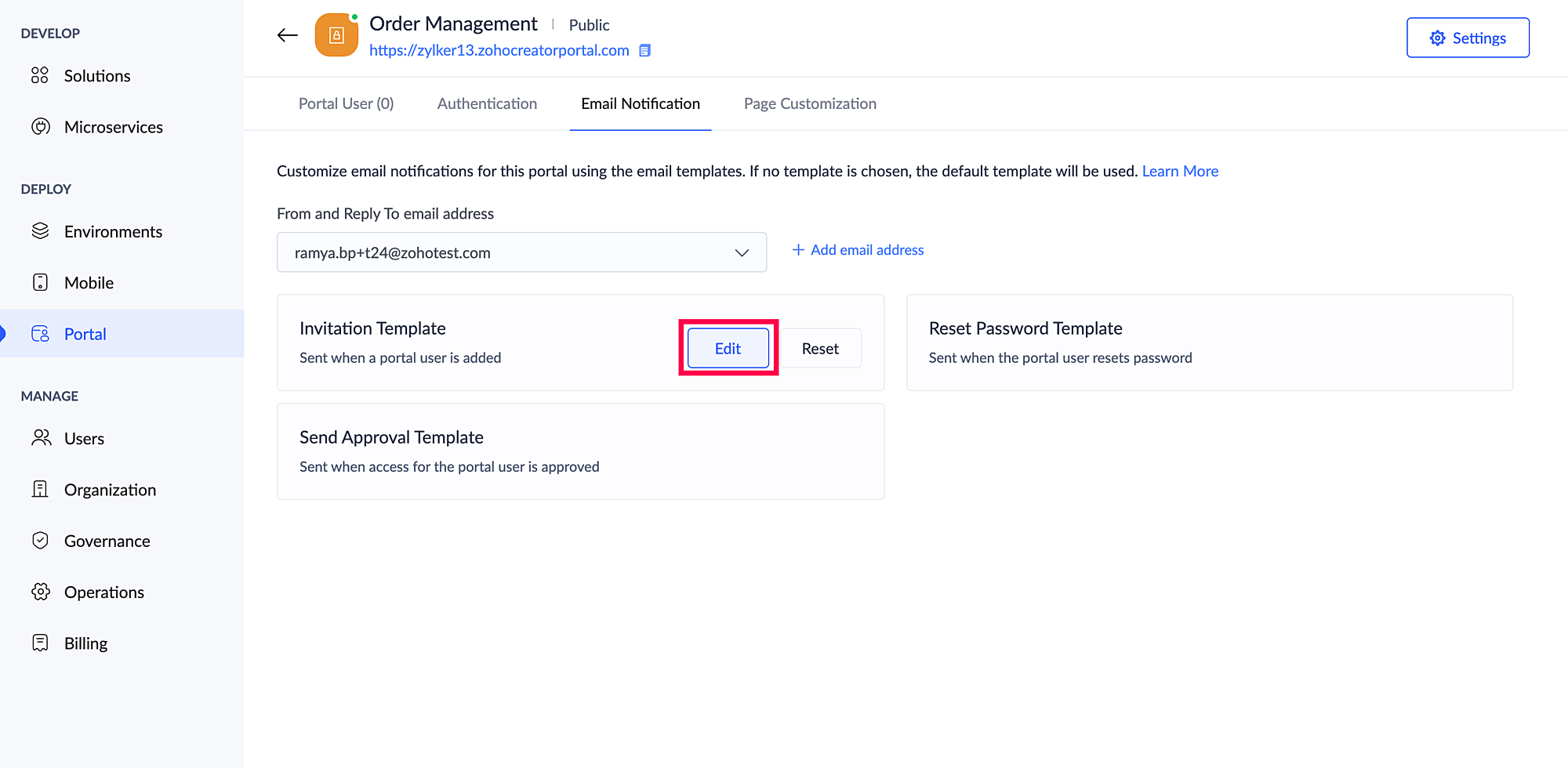 8. Navigate to the Email Notification tab and click on the Edit button of Invitation Template.