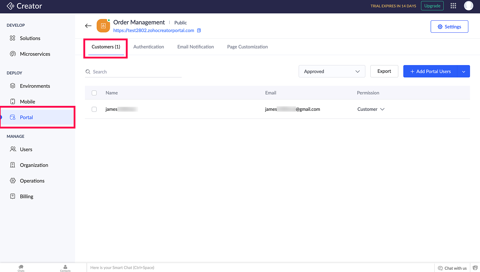 - In this tutorial, we have customized such that any user with the link to the customer portal can sign up and access it. You may also configure the portal to be accessed only by the customers whom you invite or the customers who are approved by the admin to access it. Learn more about portal types