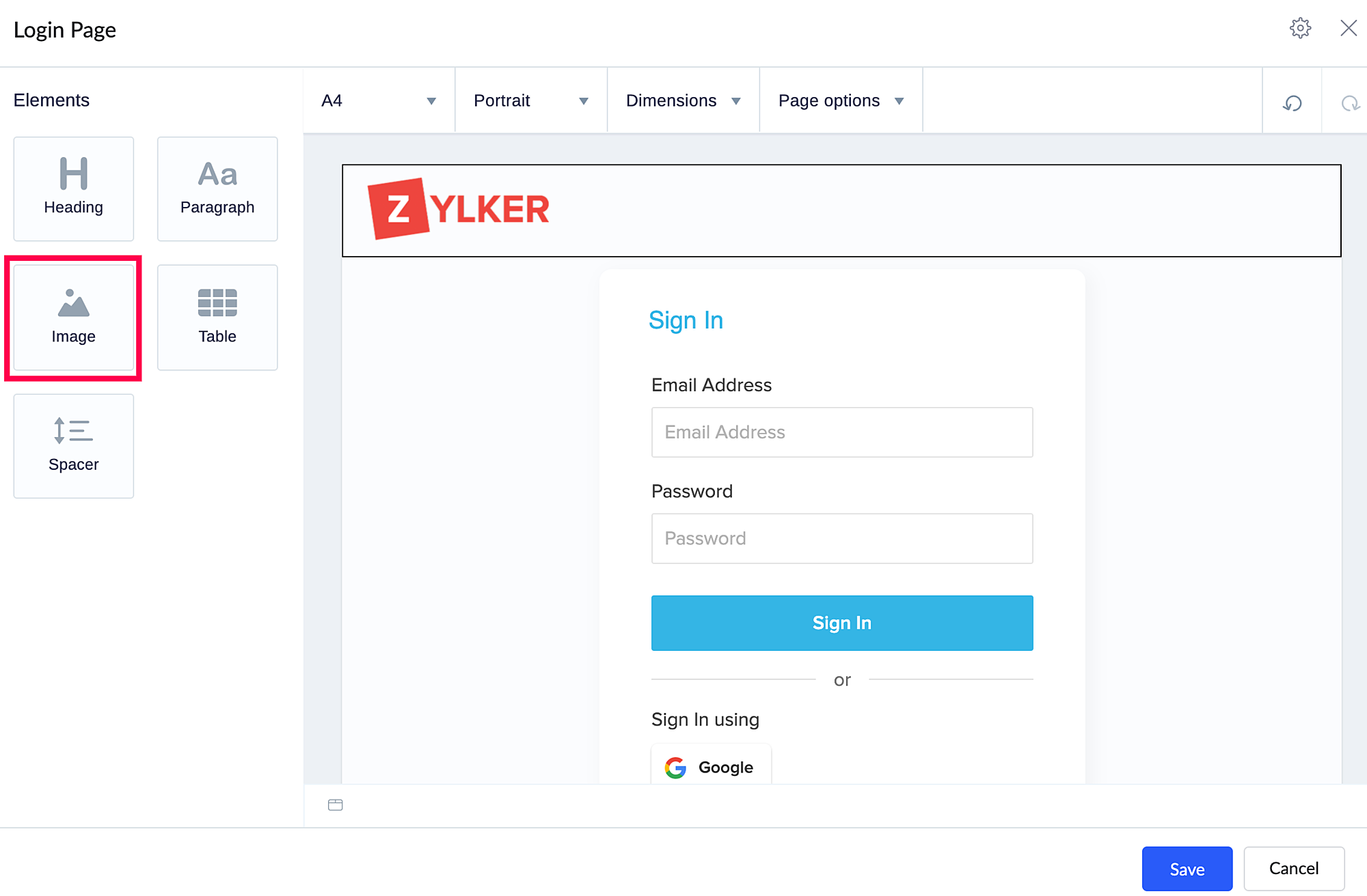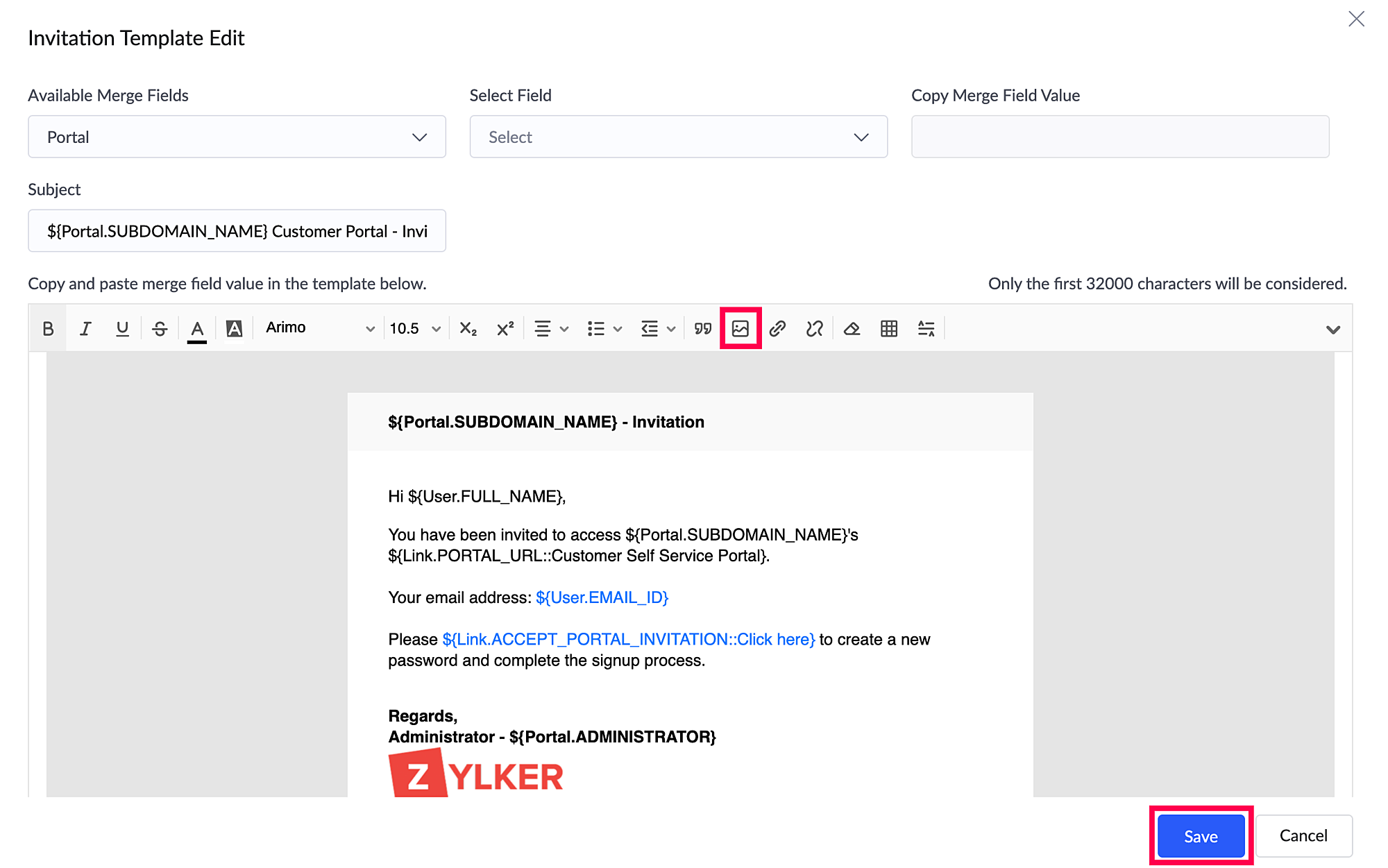 9. In the editor, use the Insert Image icon to add company's logo and click Save.