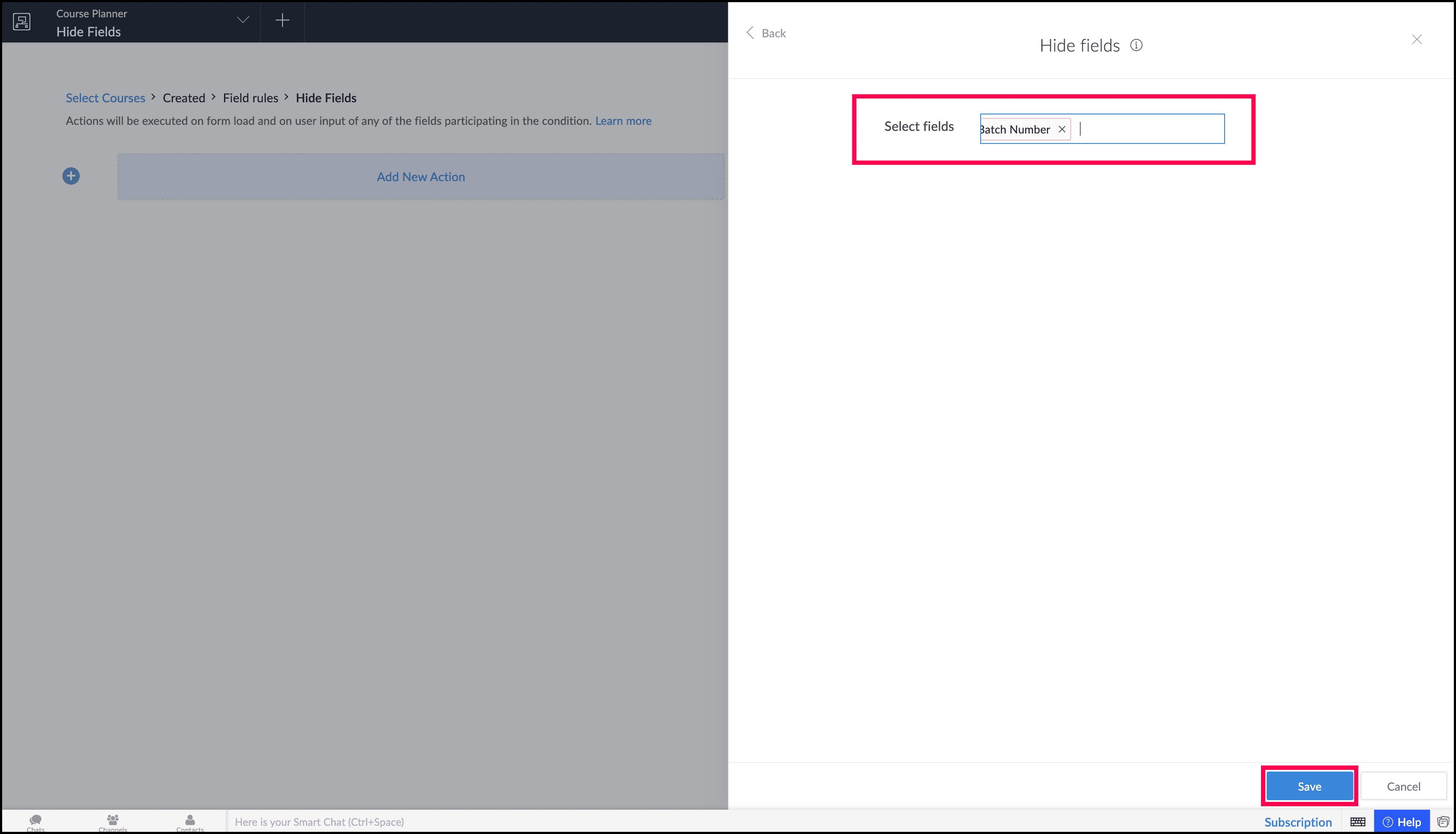 2. On the subsequent page, click Add New Action, choose Hide fields, set this action to run always, and select the Number field.