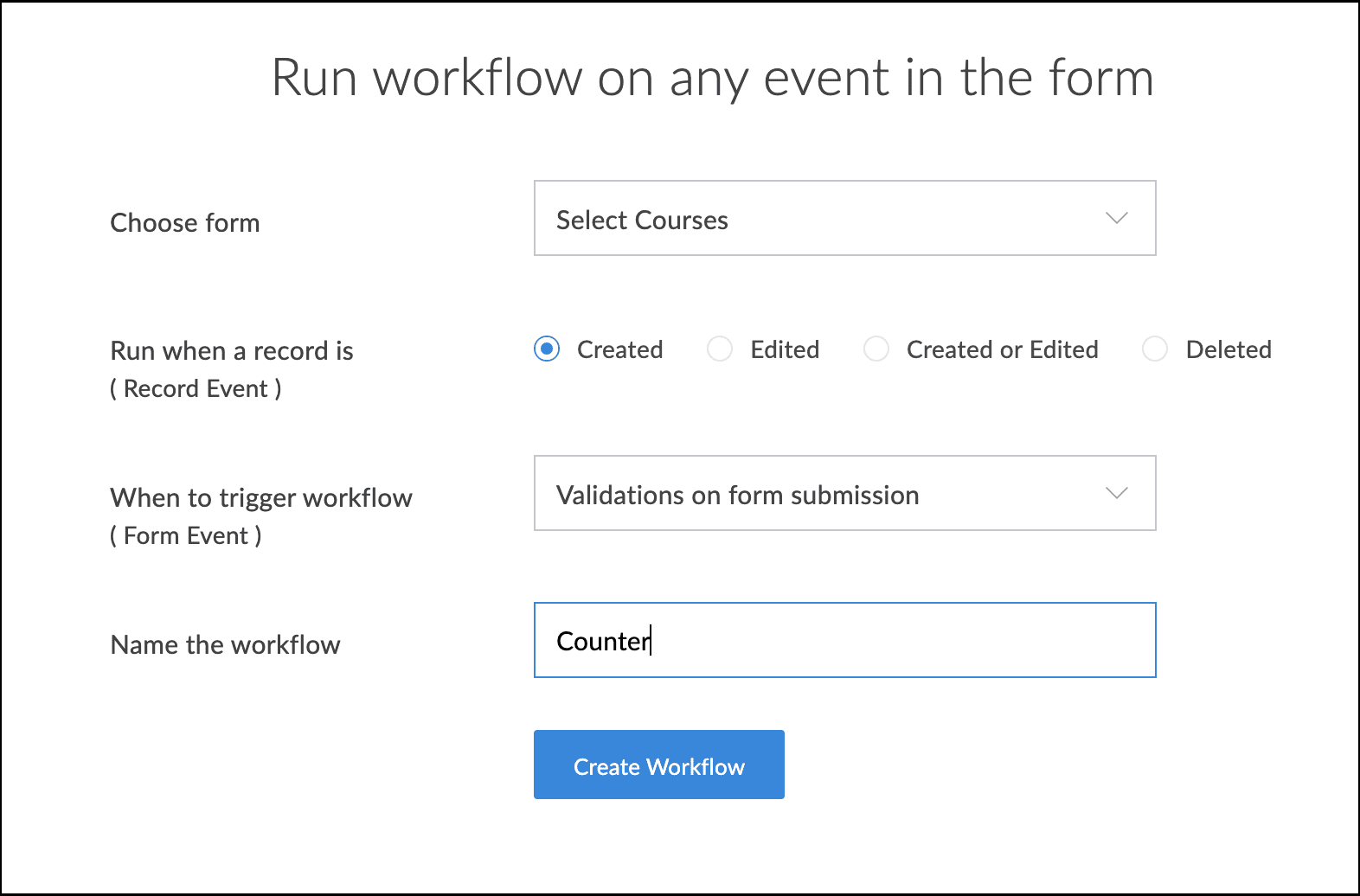 2. Create a new workflow to execute on the Validations on form submissions of the form and select the record event as Created.