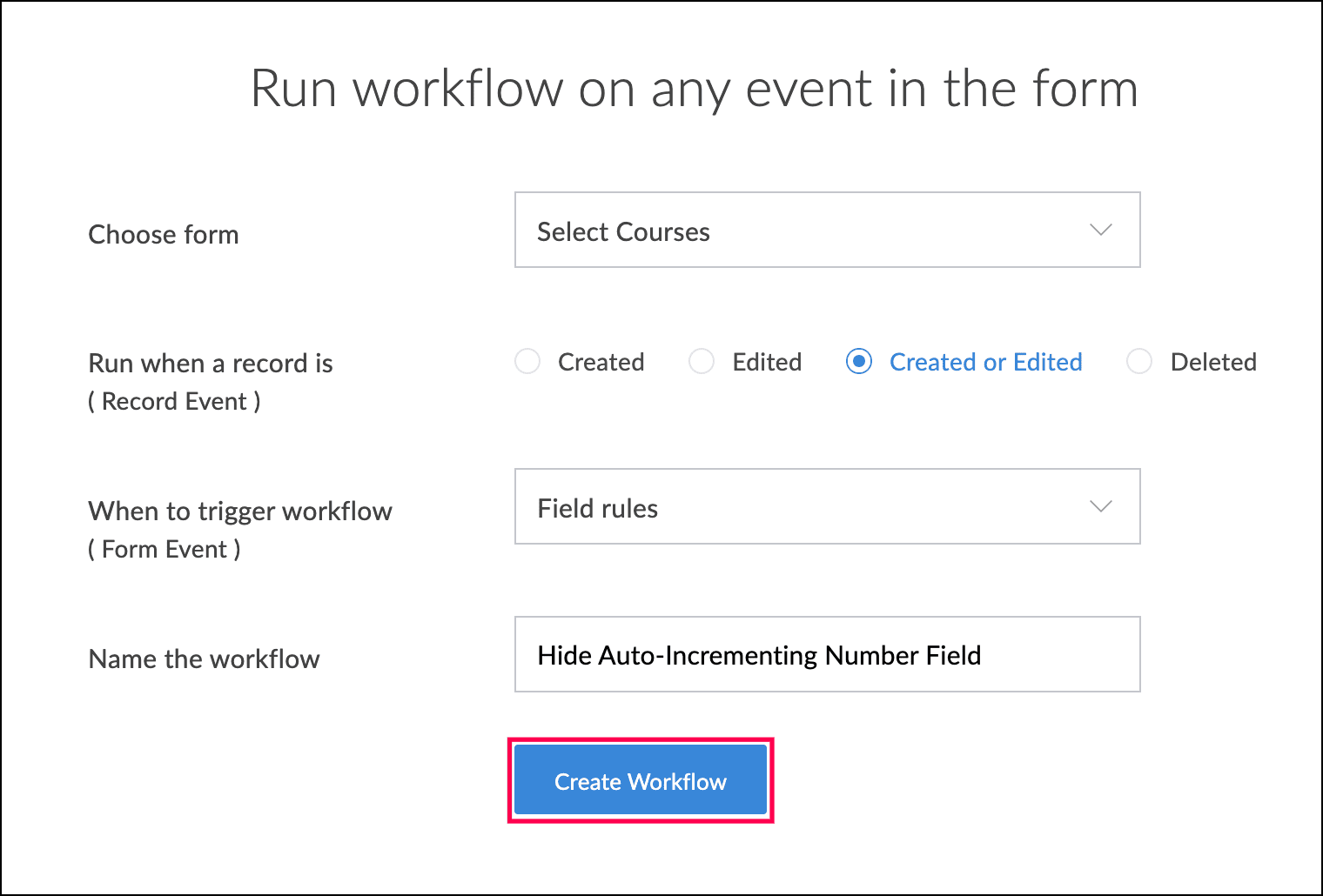 1. Create a workflow by selecting the record event as Created or Edited and the form event as Field rules.