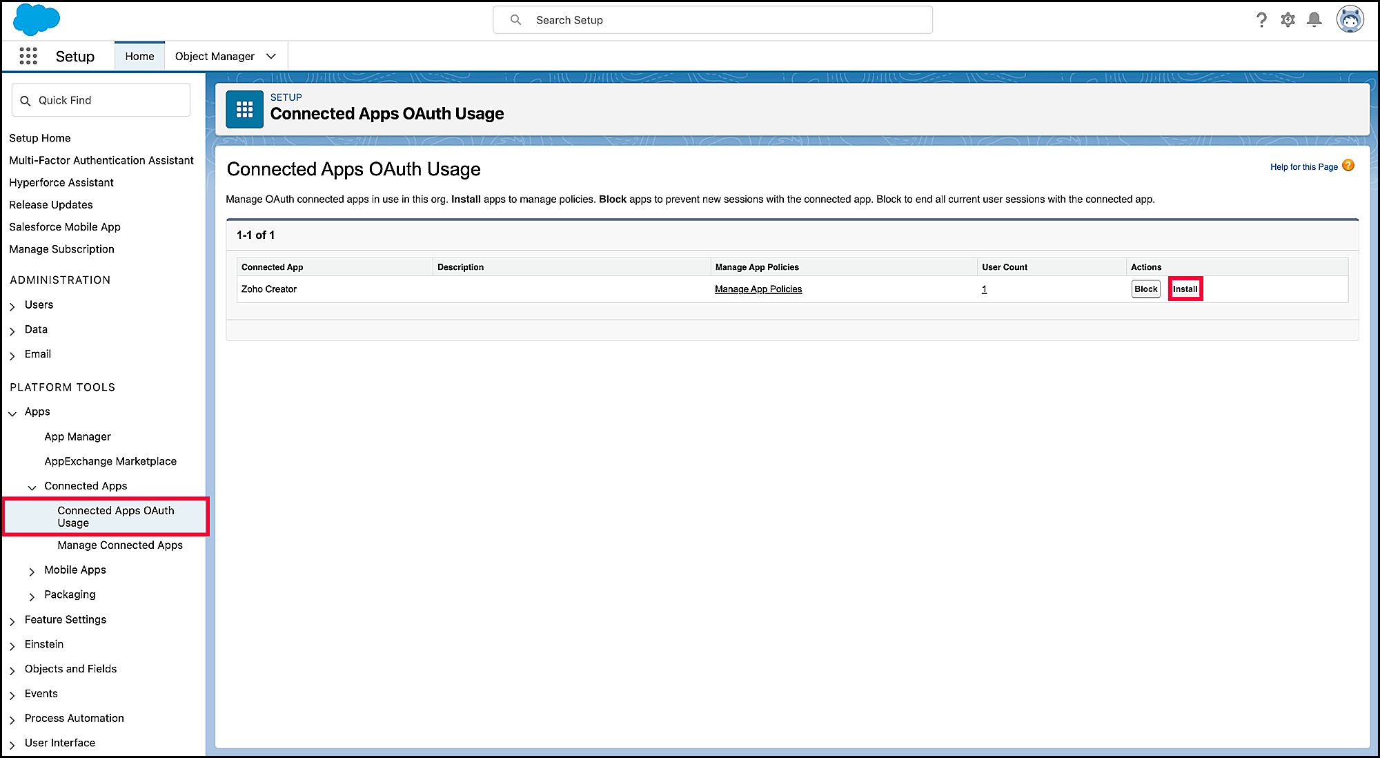 Steps to follow in your Salesforce account to allow OAuth access to the Zoho Creator application.