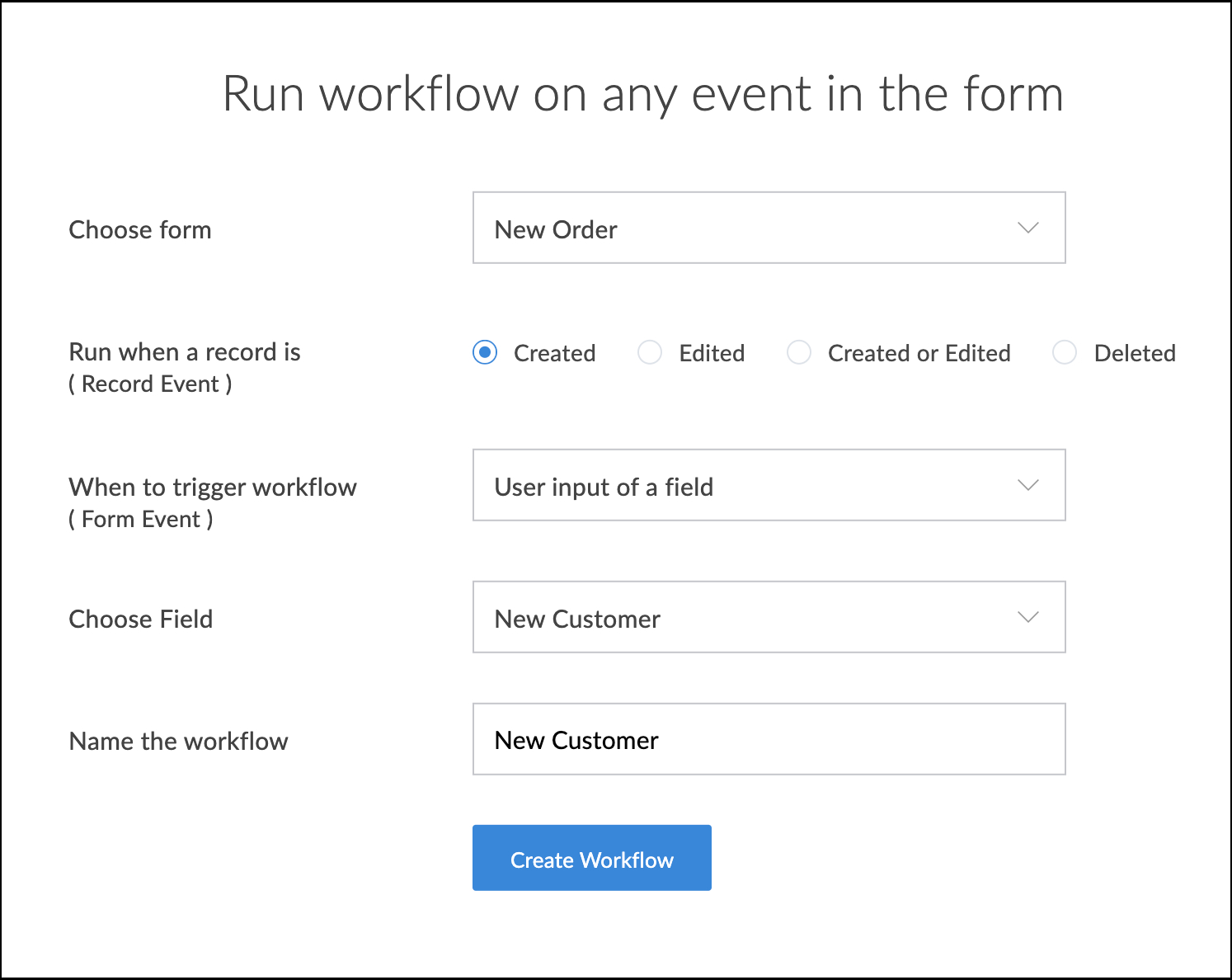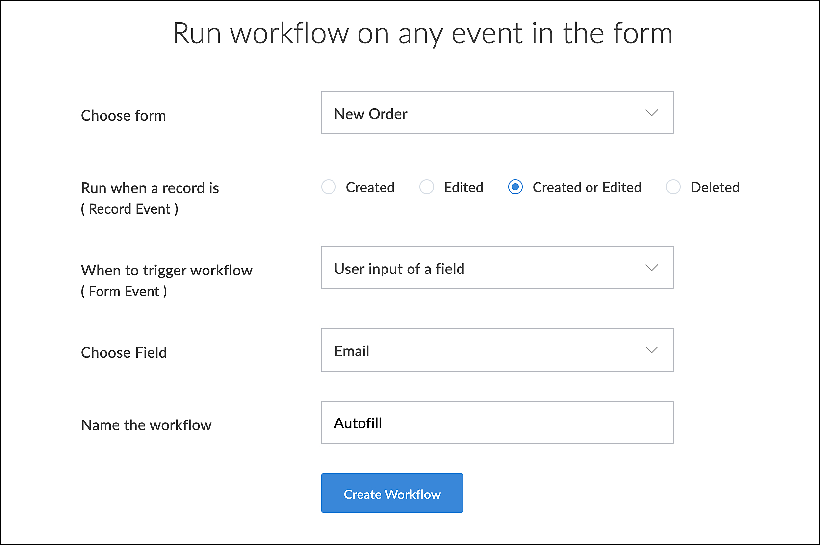 - Create another workflow to execute on user input of Email field in the New Order form with the details shown below. This workflow will fetch the customer details form the Salesforce and auto populate data in the respective fields.