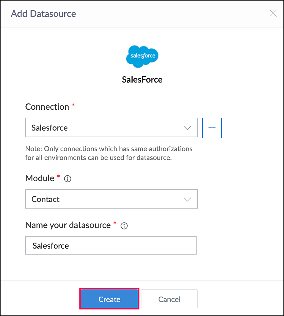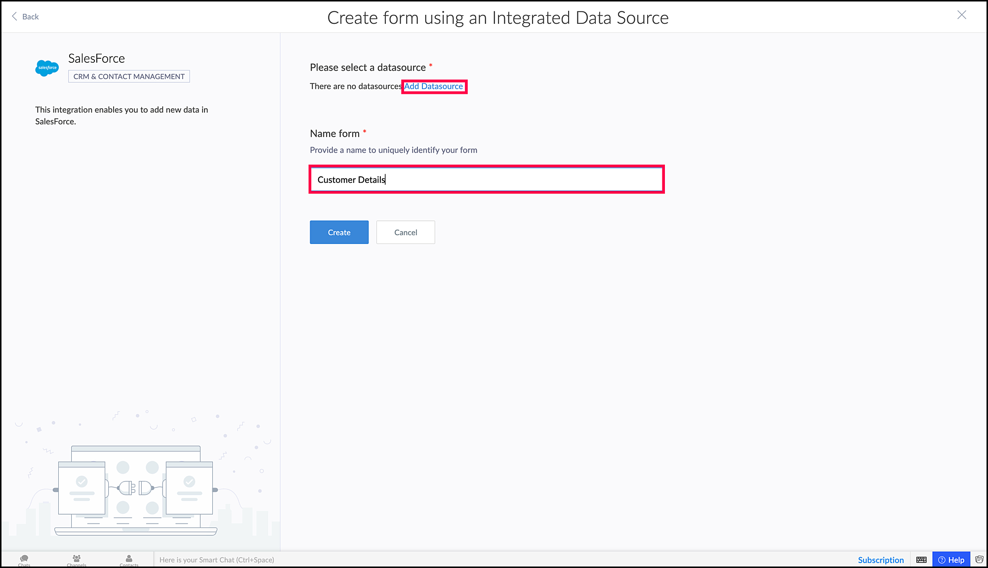 - Create an integration form to add the customer details to Salesforce, with the name Customer Details, and click Add Datasource.