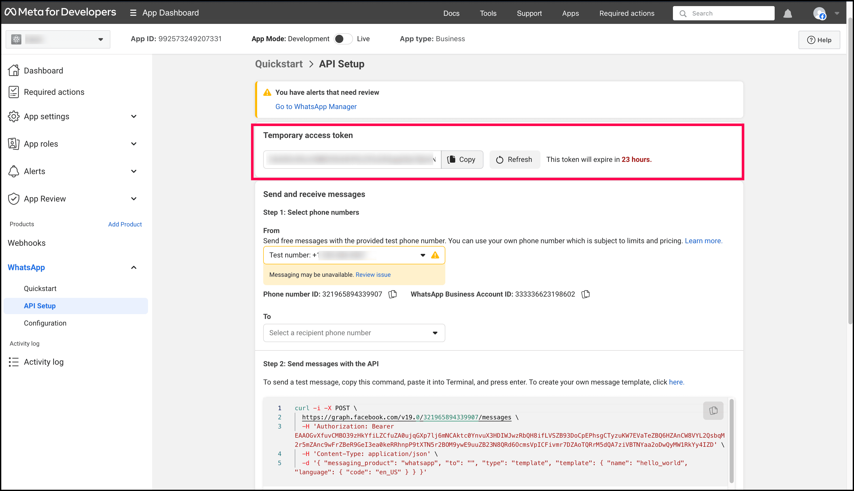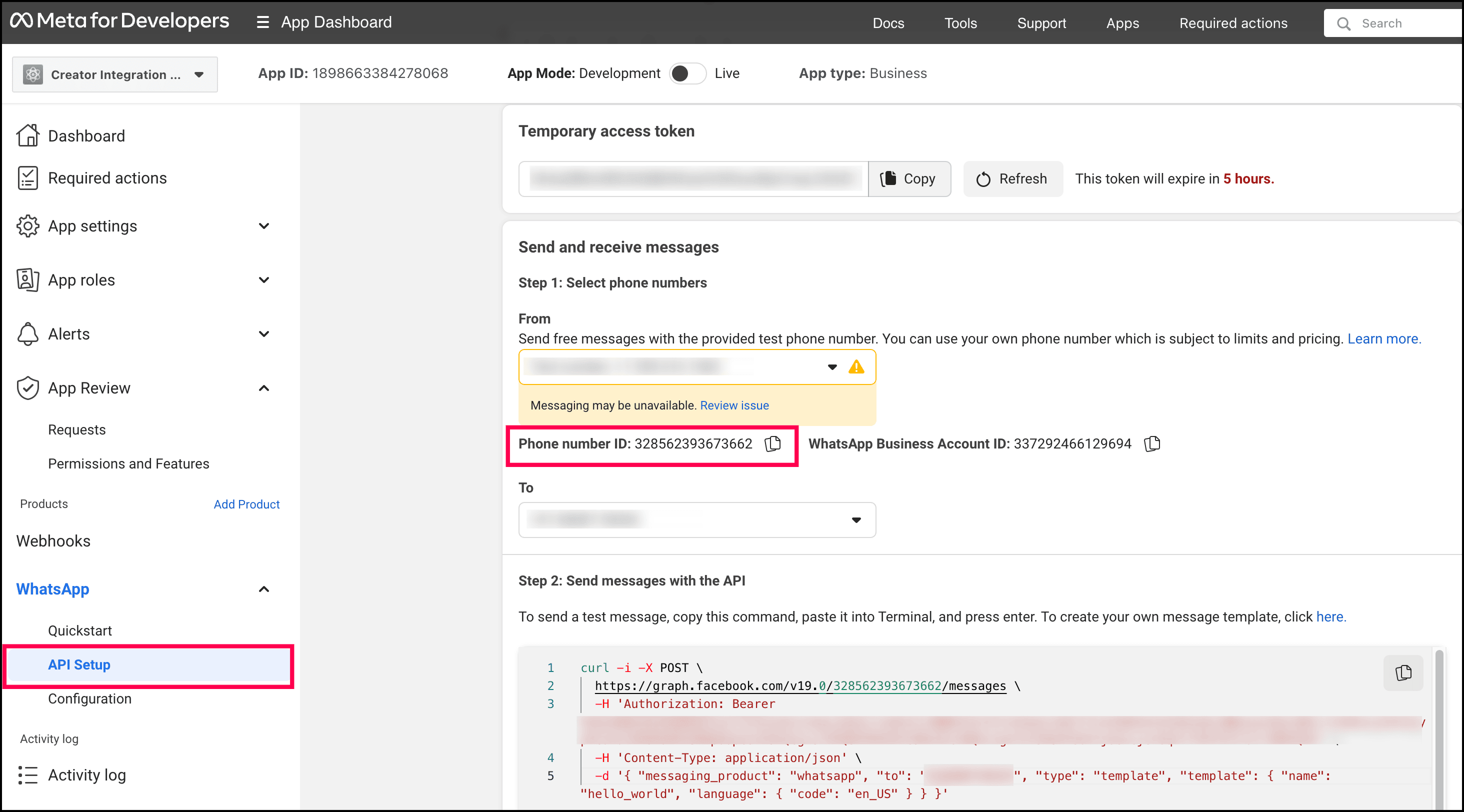 <PhoneNumberID> | is the ID of the Phone number added in your WhatsApp Business Account. You can find it in the API Setup under WhatsApp in your App Dashboard of Meta application. Example : 328562393673662 |