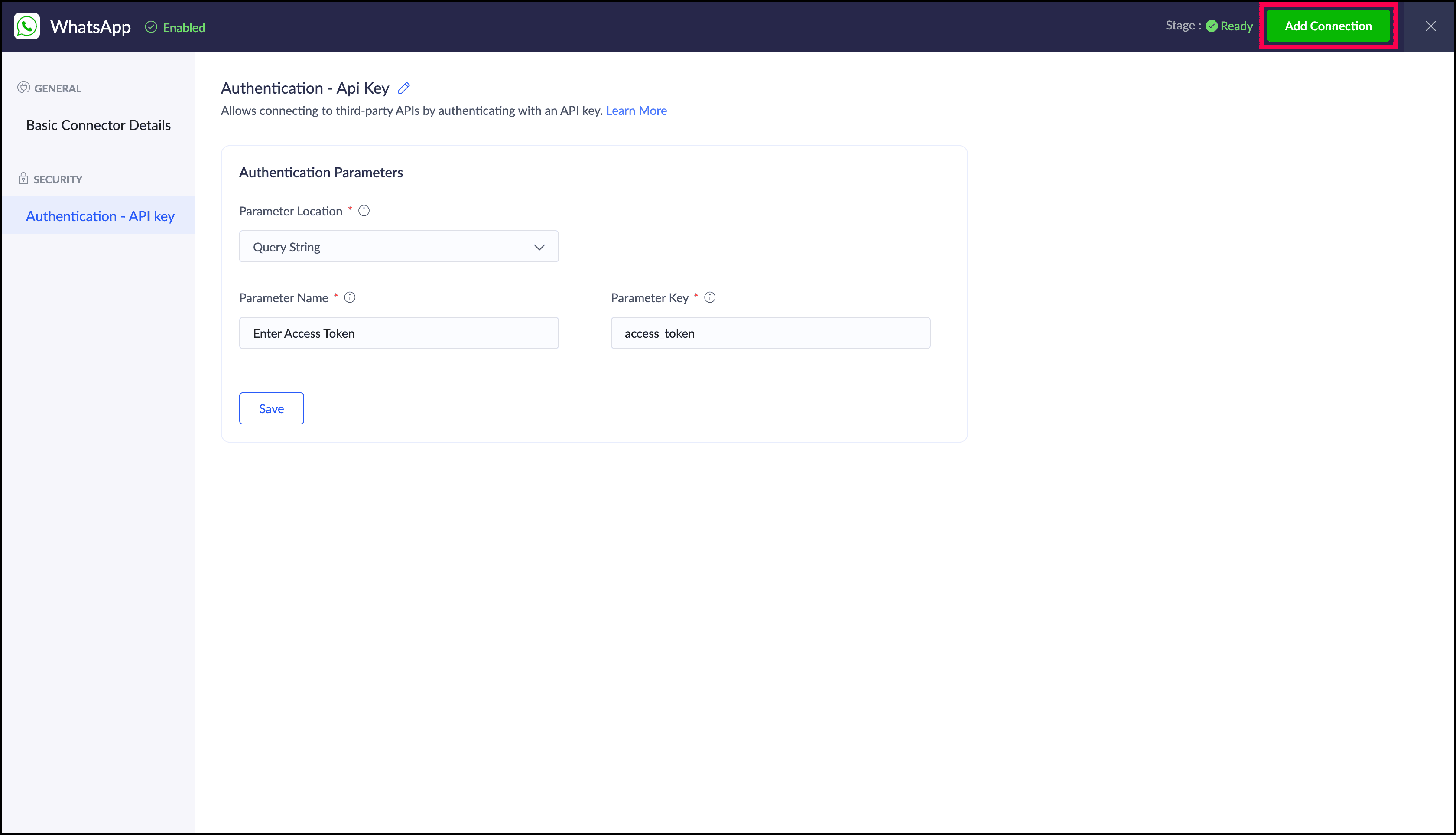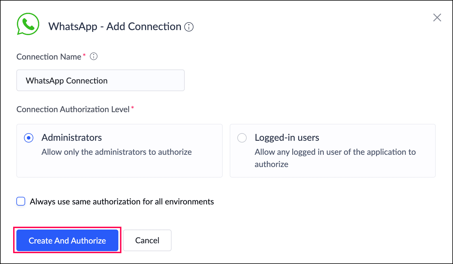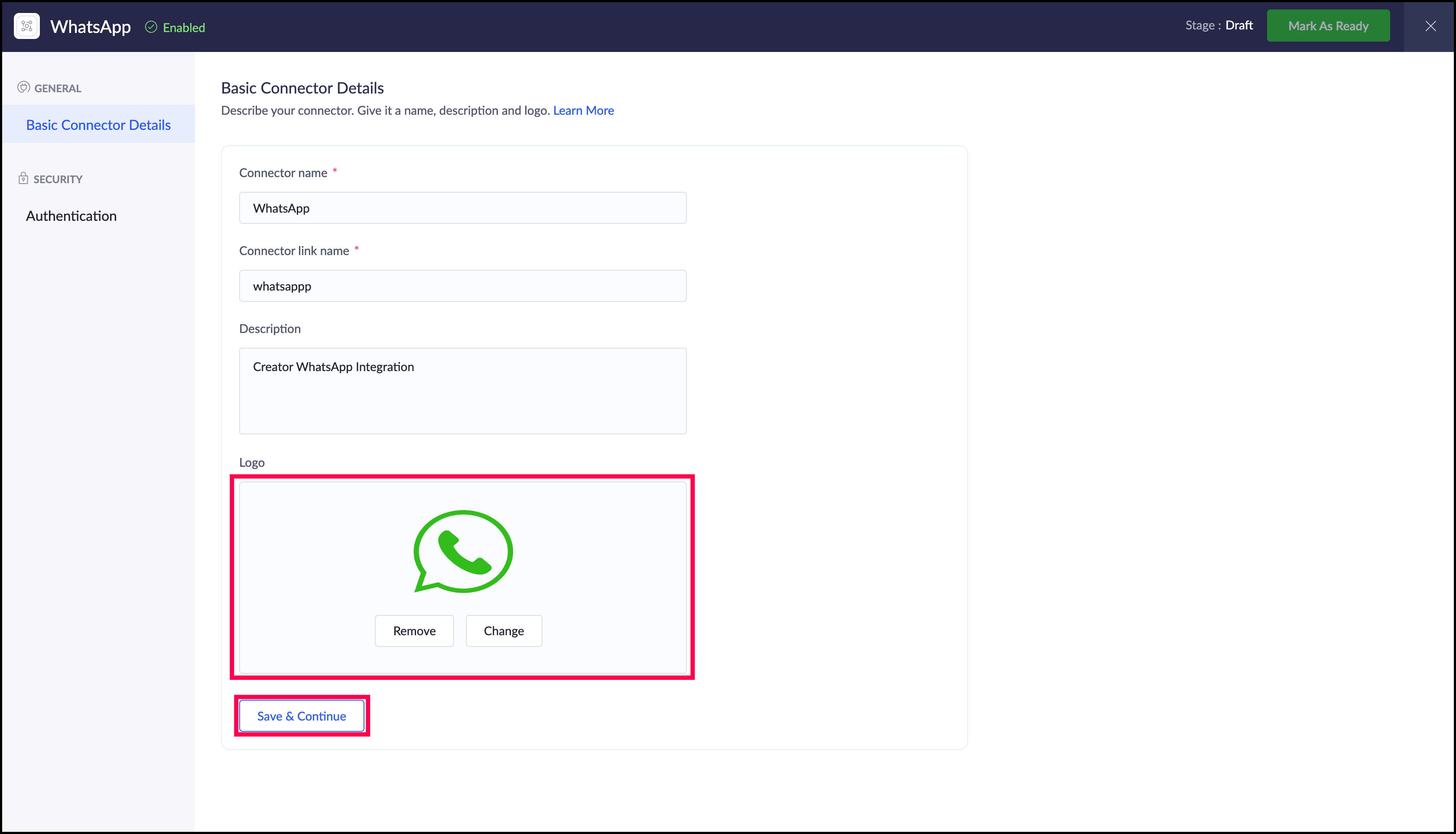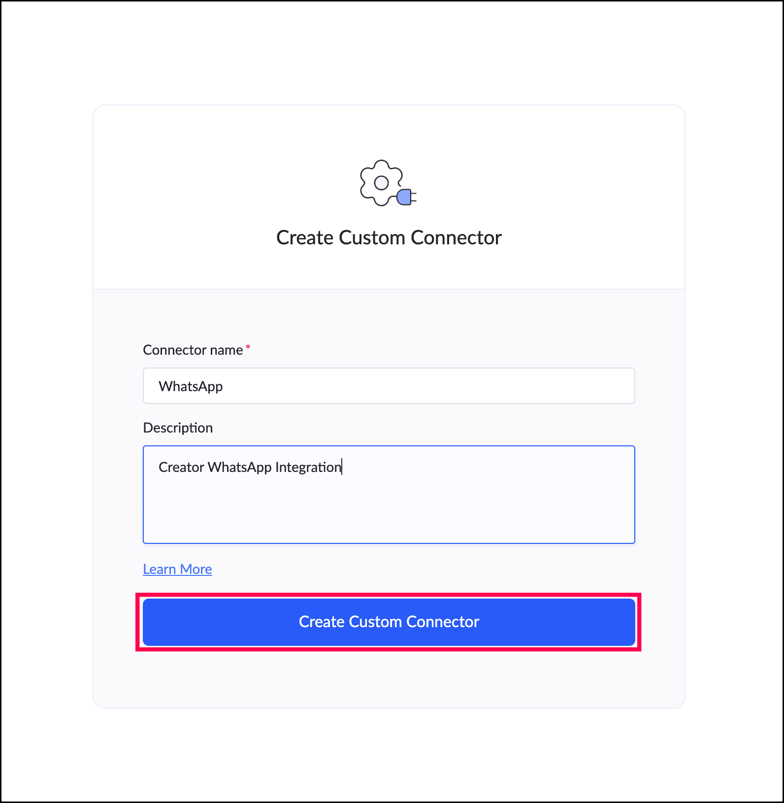 "whatsapp_connection" | is the name of the WhatsApp connection created using Custom Connector. |
