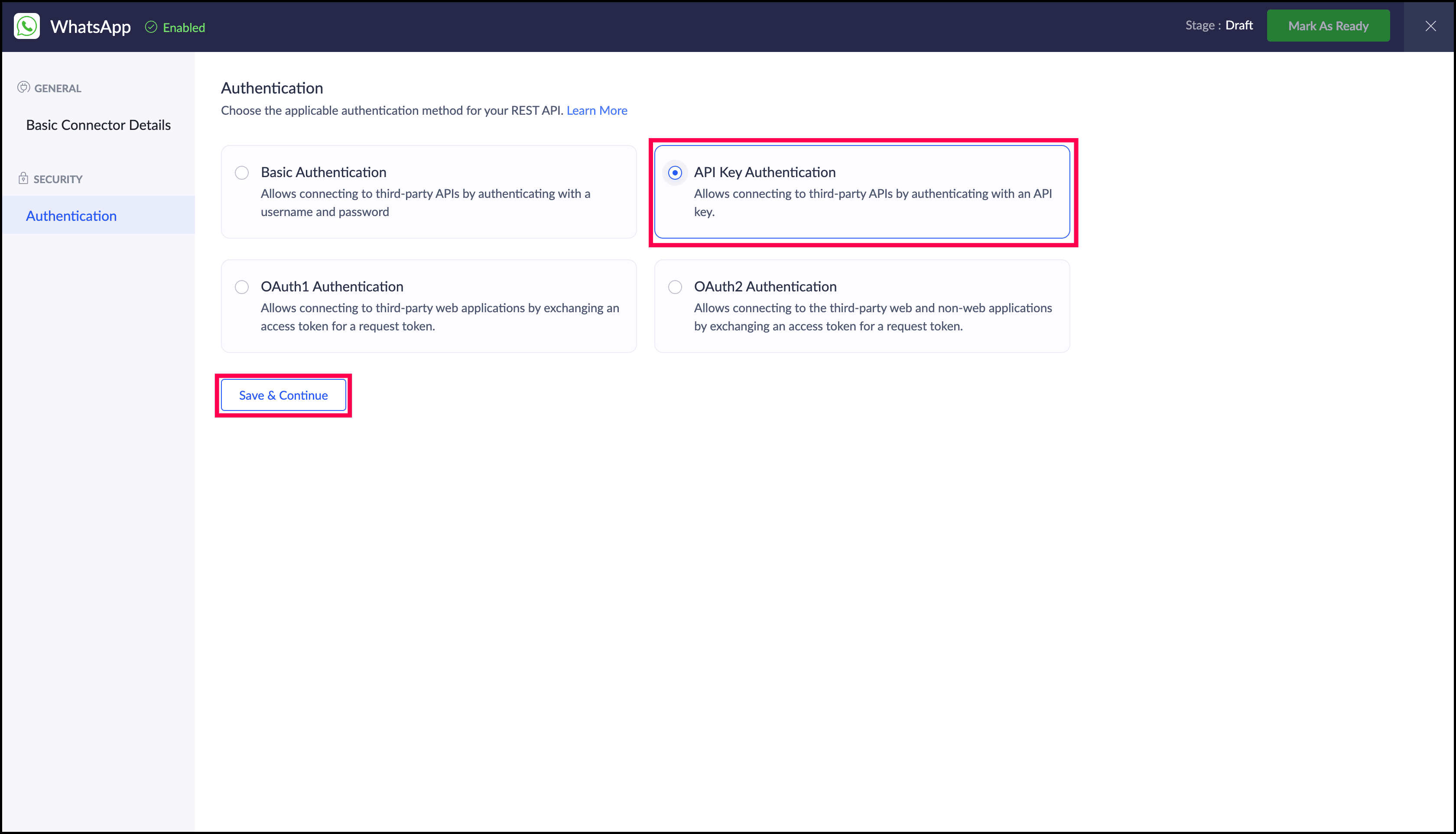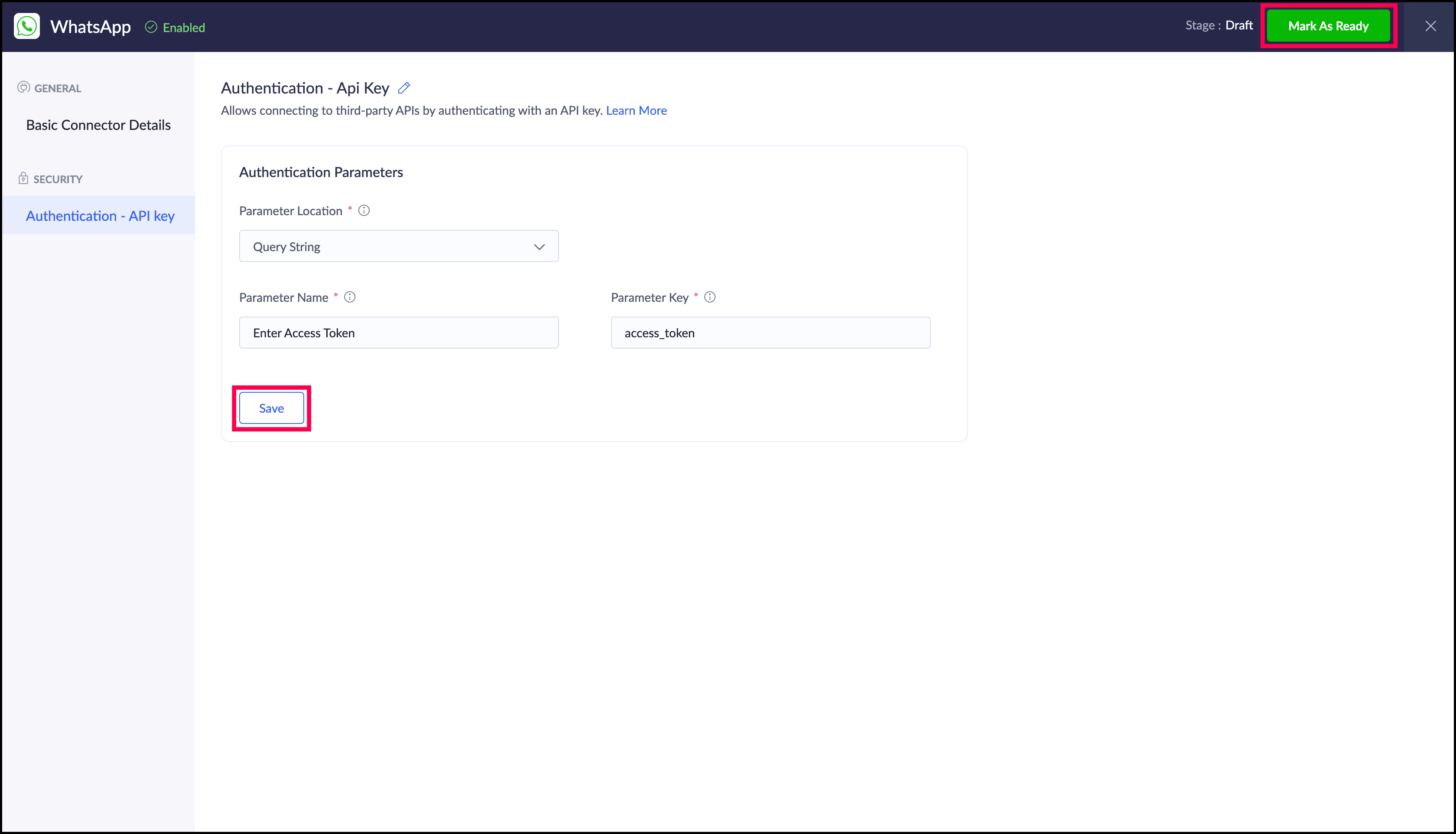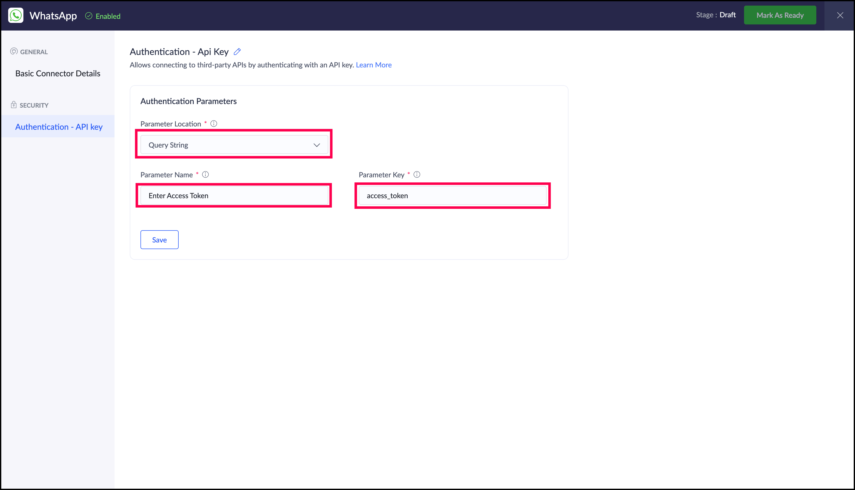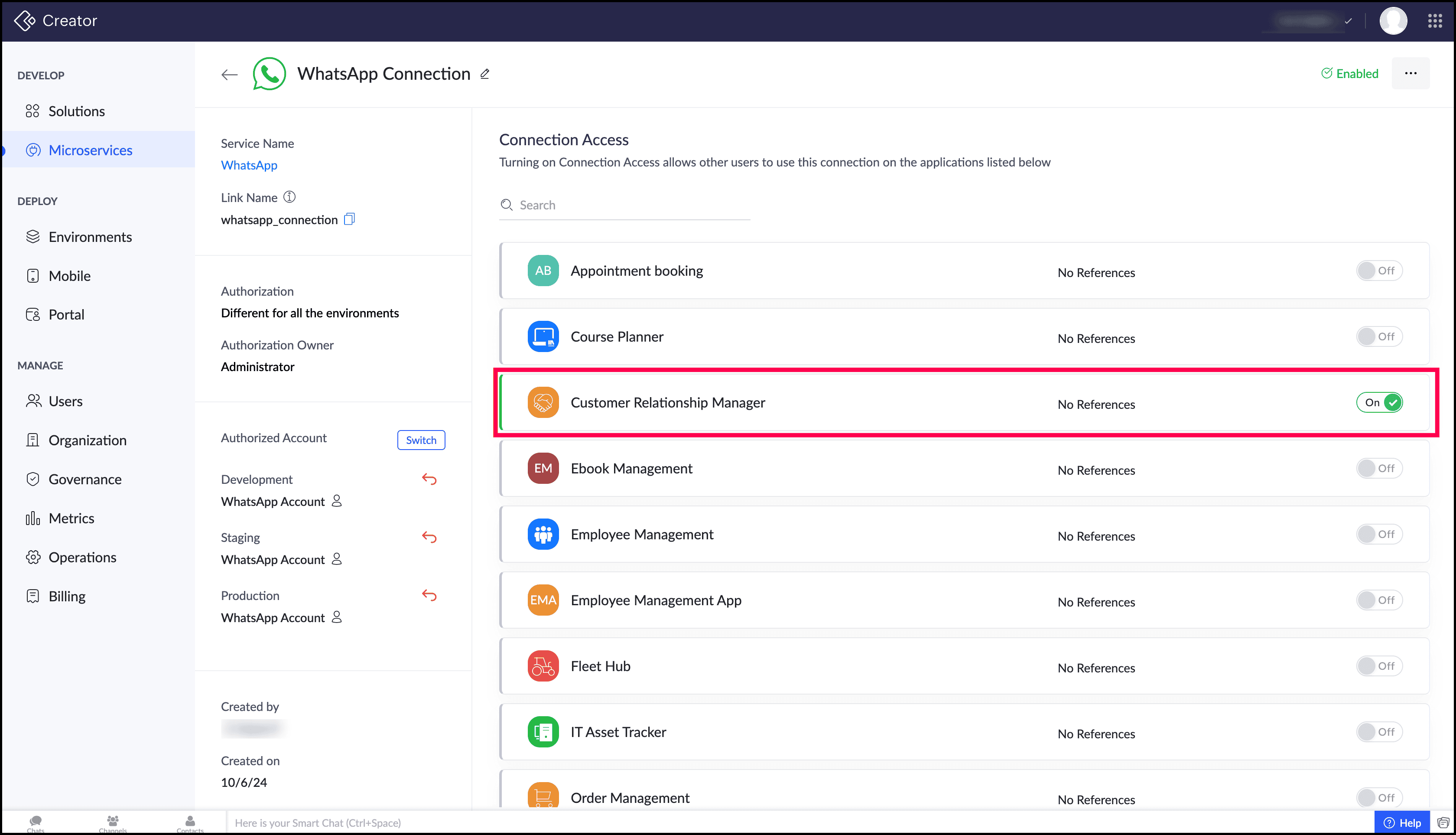 "whatsapp_connection" | is the name of the WhatsApp connection created using Custom Connector. |