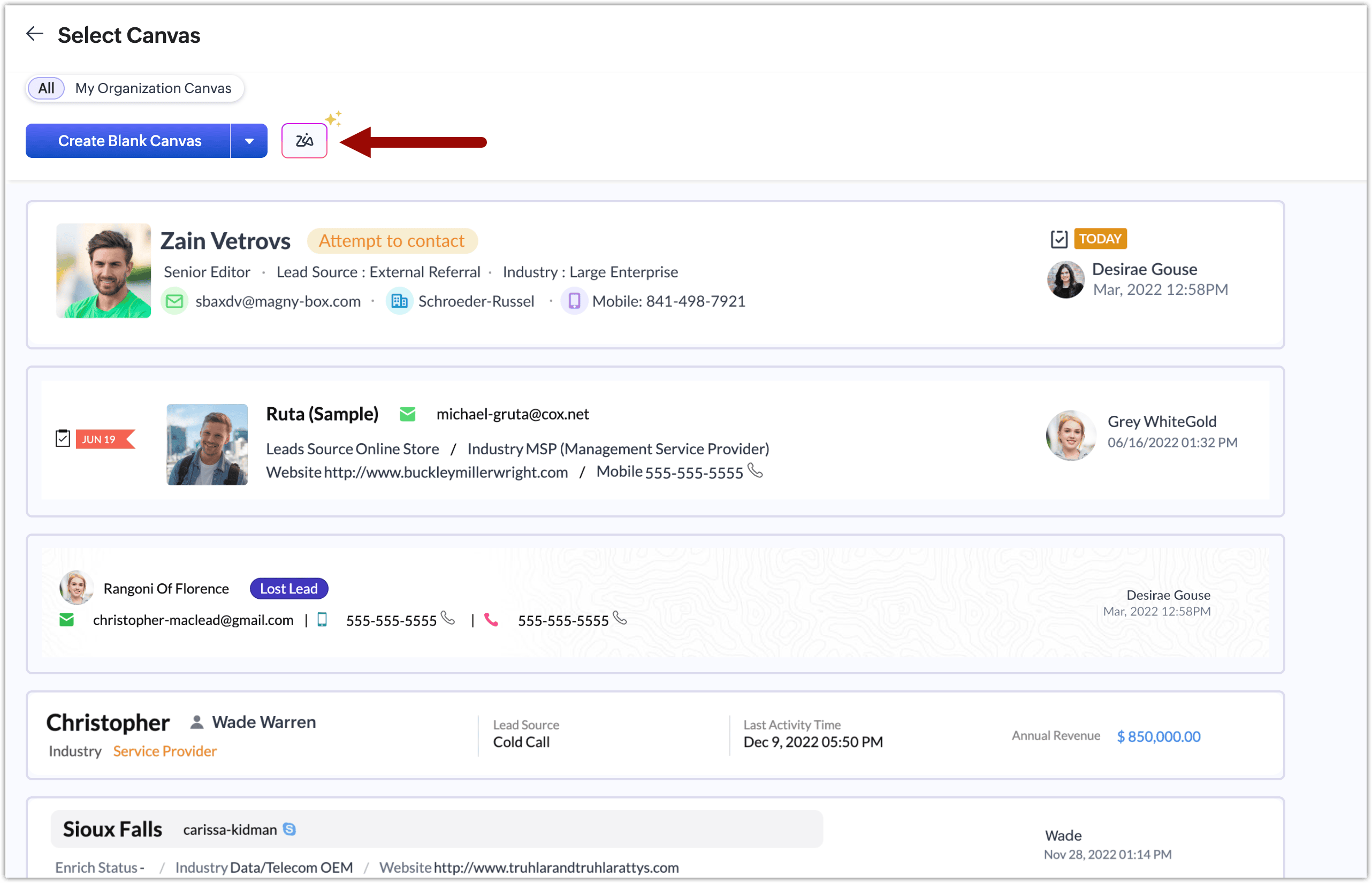 The custom list view enables you to stack records horizontally, one above the other. The space each row provides can comfortably and prominently display your business logo, lead images, lead information, buttons, and more. This view is clutter-free and suitable for storing information about your customers and CRM users in tandem.