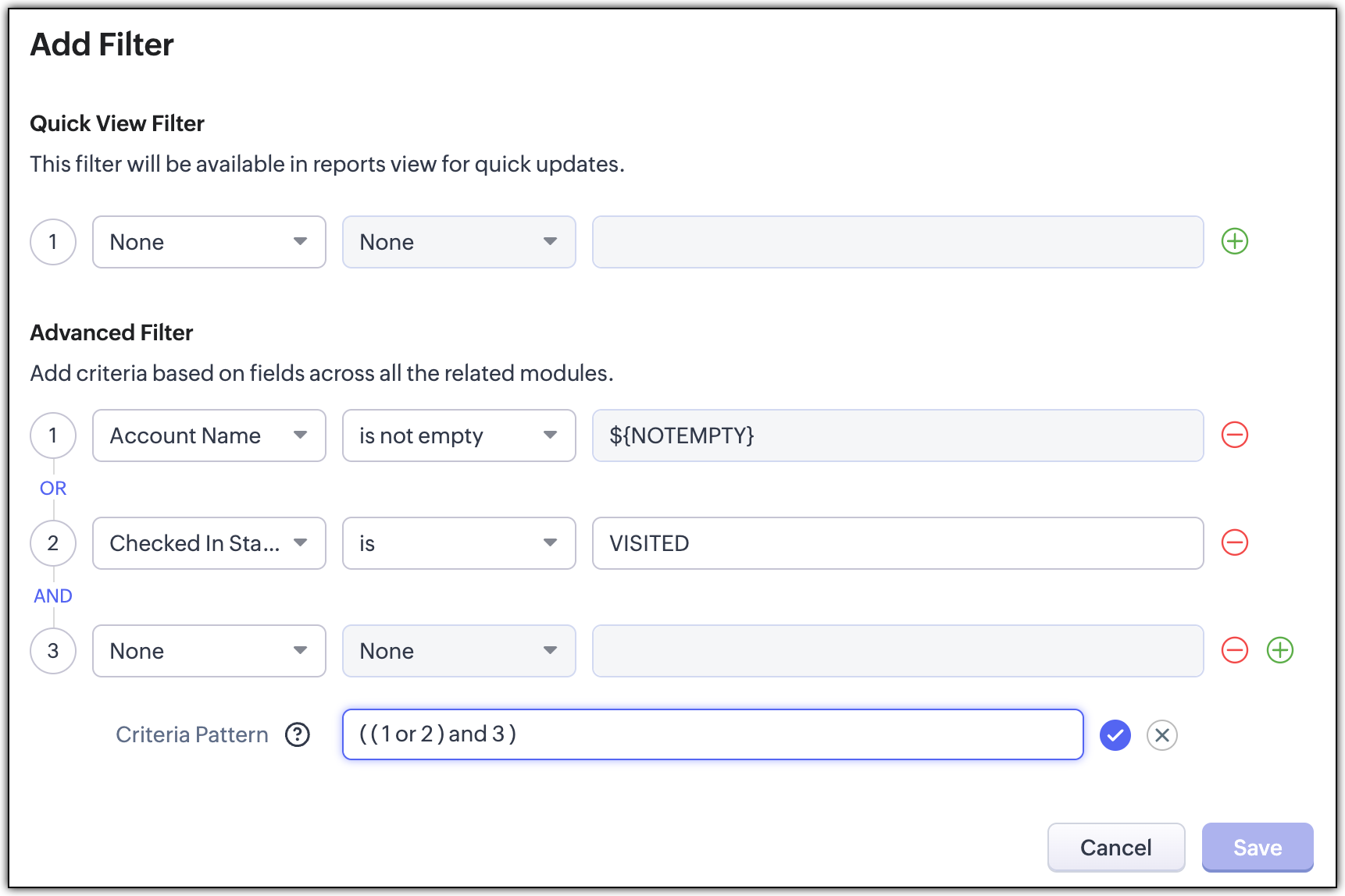 Stage is 'Closed Won', and Deal Owner is 'Manish Patel or Martin Wilson', and Expected Revenue is greater than '$10000 USD', and Lead Source is 'Cold Call or Web Form'. The criteria pattern will be automatically. Since the criteria pattern does not match the requirement, you can edit it as:
