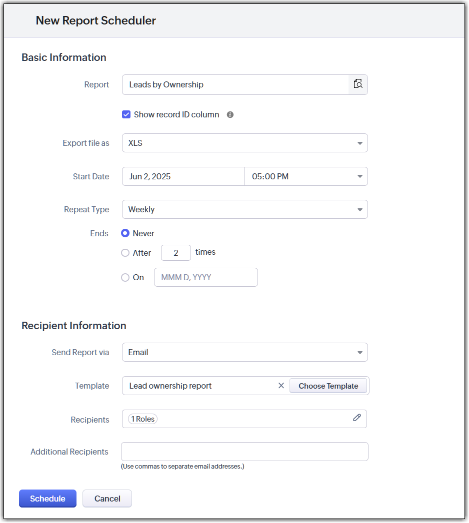 Start Date | Specify the start date of scheduling the report | Mandatory field. The standard date format is mm/dd/yy |
